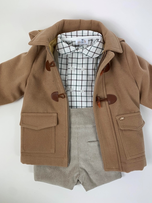 Beige corduroy short with braces look, brown and green plaid shirt and camel toddler boy coat