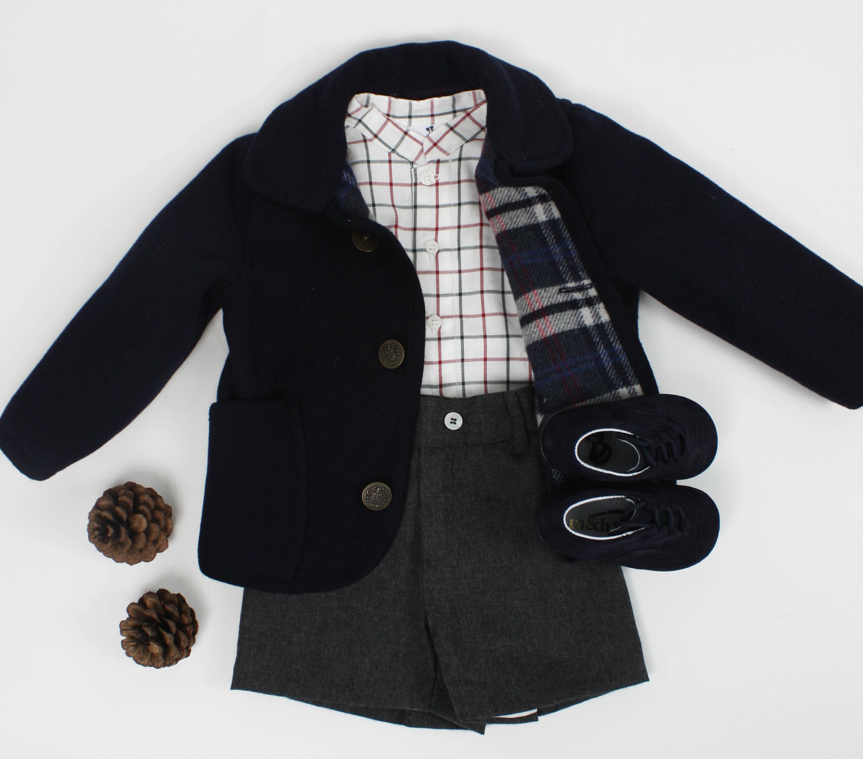 Boy´s look. Blue marine austrian, mao shirt, grey short and shoes.
