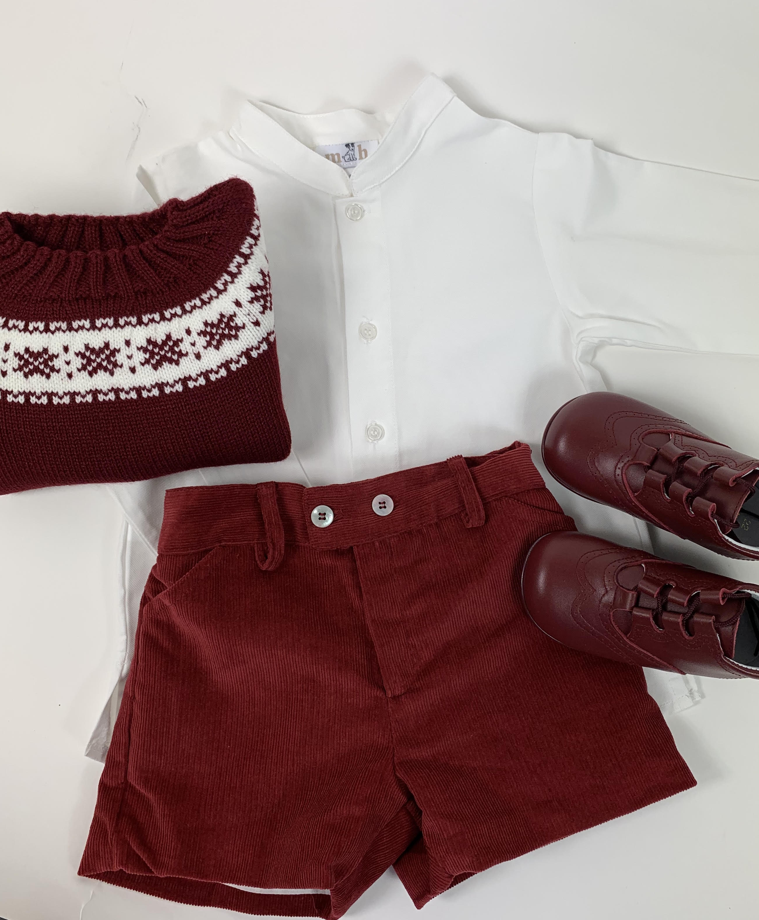 Burgundy corduroy short look, off-white mao shirt, knit sweater and burgundy leather boots