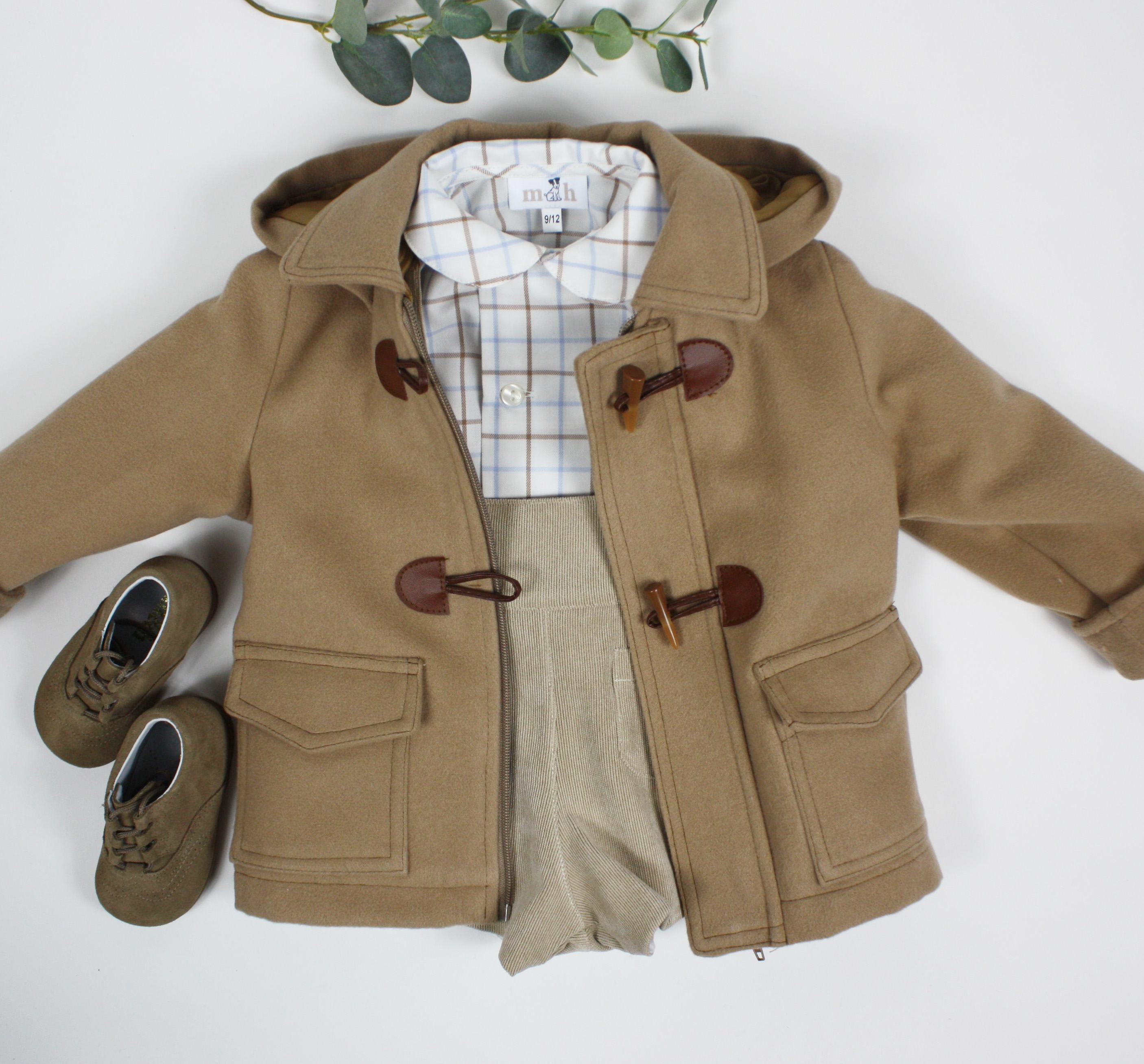 Boy look. Camel duffle coat, short corduroy, beige and blue plaid and shoes. Made in Spain by m&h