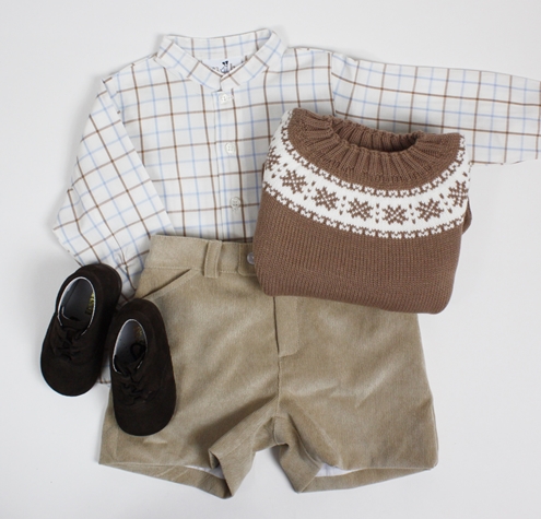Toddler boy look with corduroy bermuda, mao shirt, cámel sweater and brown suede shoes