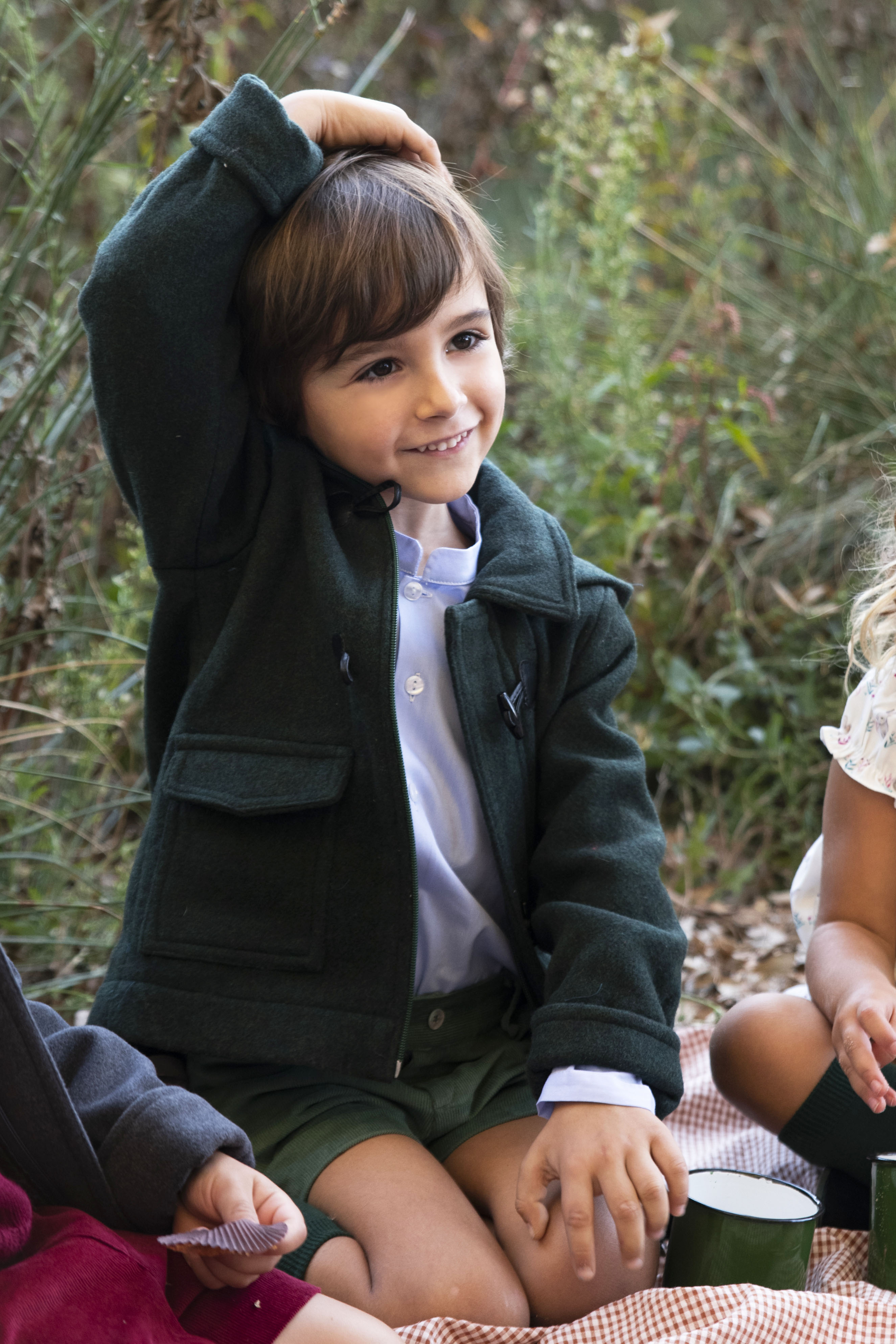 Green look for boy, green corduroy bermuda, mao collar shirt in blue and green boy coat
