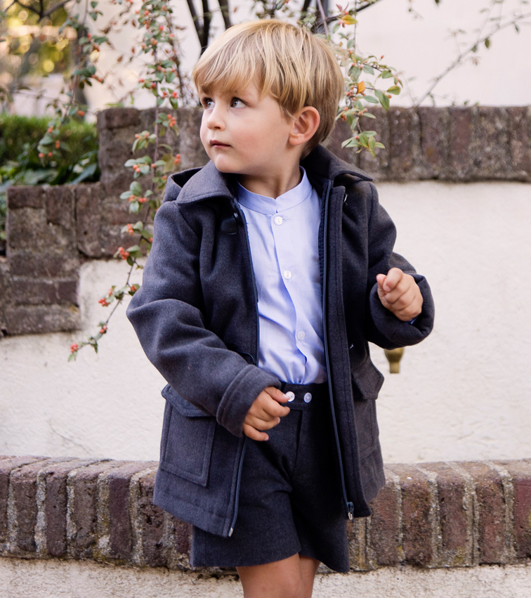 Grey duffle coat look, mao collar shirt in blue and grey flannel
