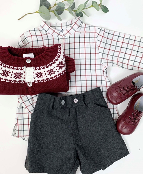Grey toddler boy short look. mao and plaid collar shirt, knit cardigan and burgundy leather shoes