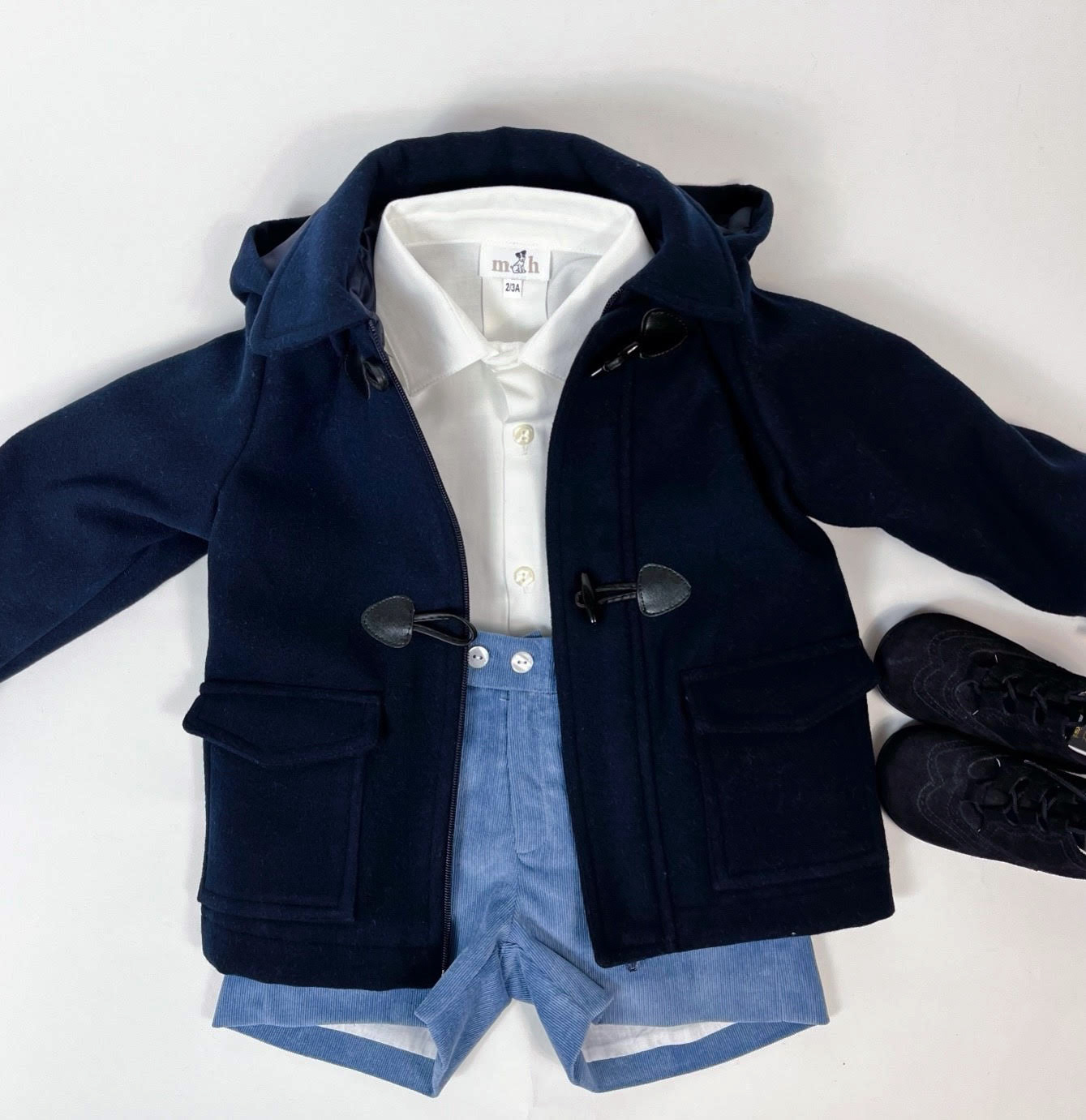 Medium blue short look, ecrue shirt, duffle coat in navy blue and suede shoes.