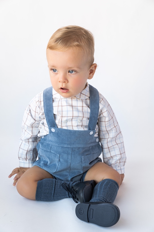 Short with braces medium blue look, sand plaid baby shirt and navy blue leather shoes