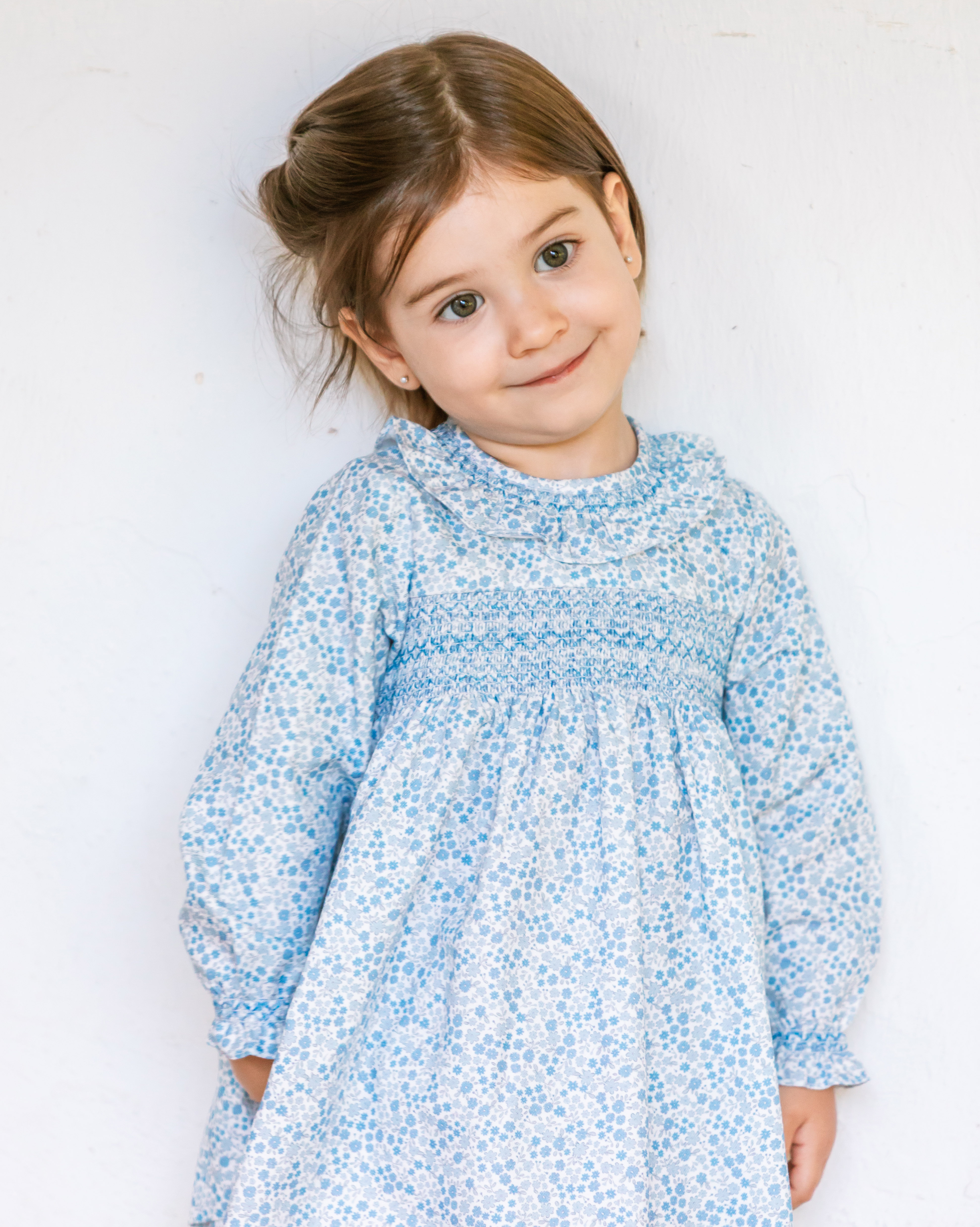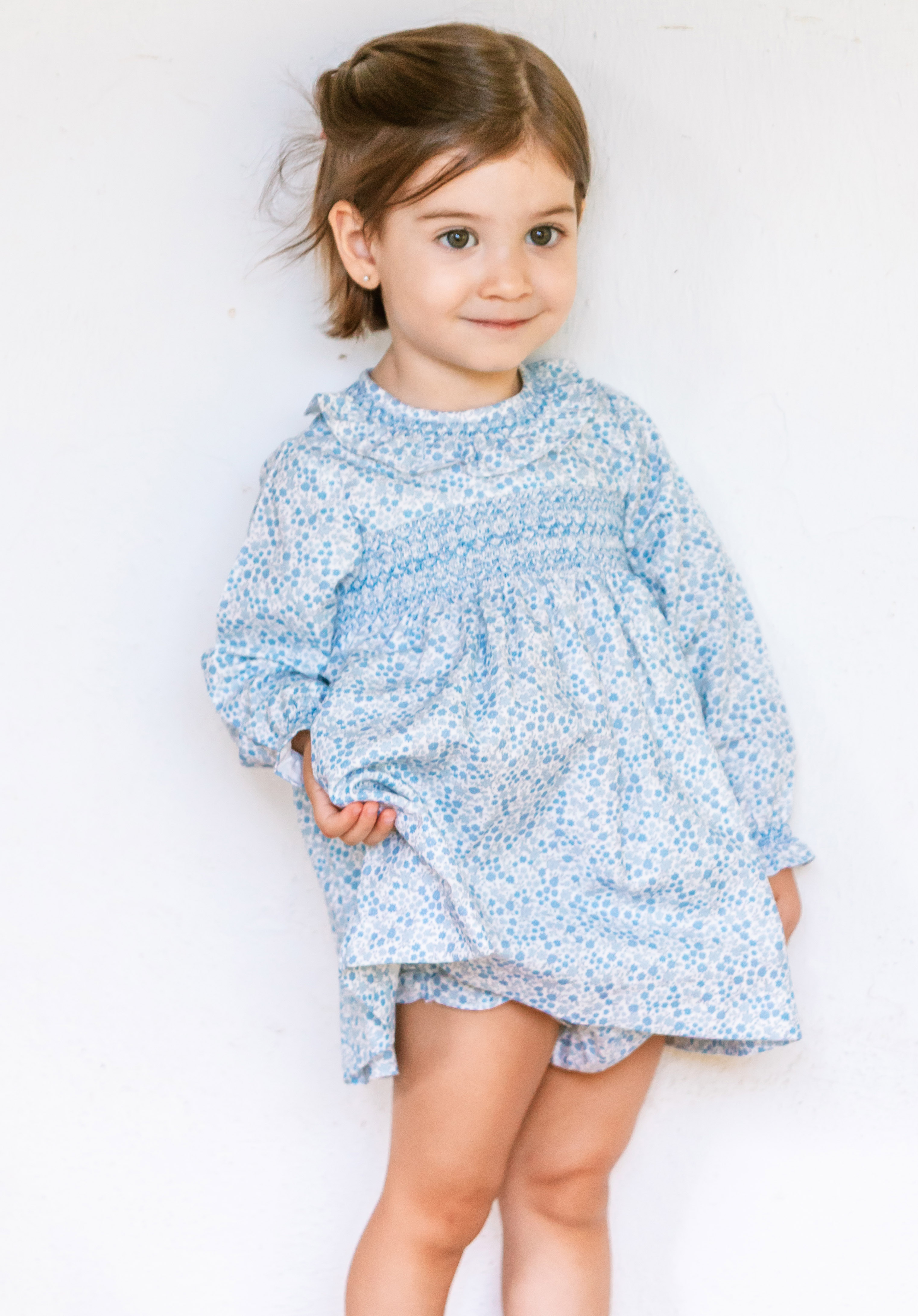 Baby dress with long sleeves in a blue flowers print. Diaper cover up to 2A. Made in Spain by m&h