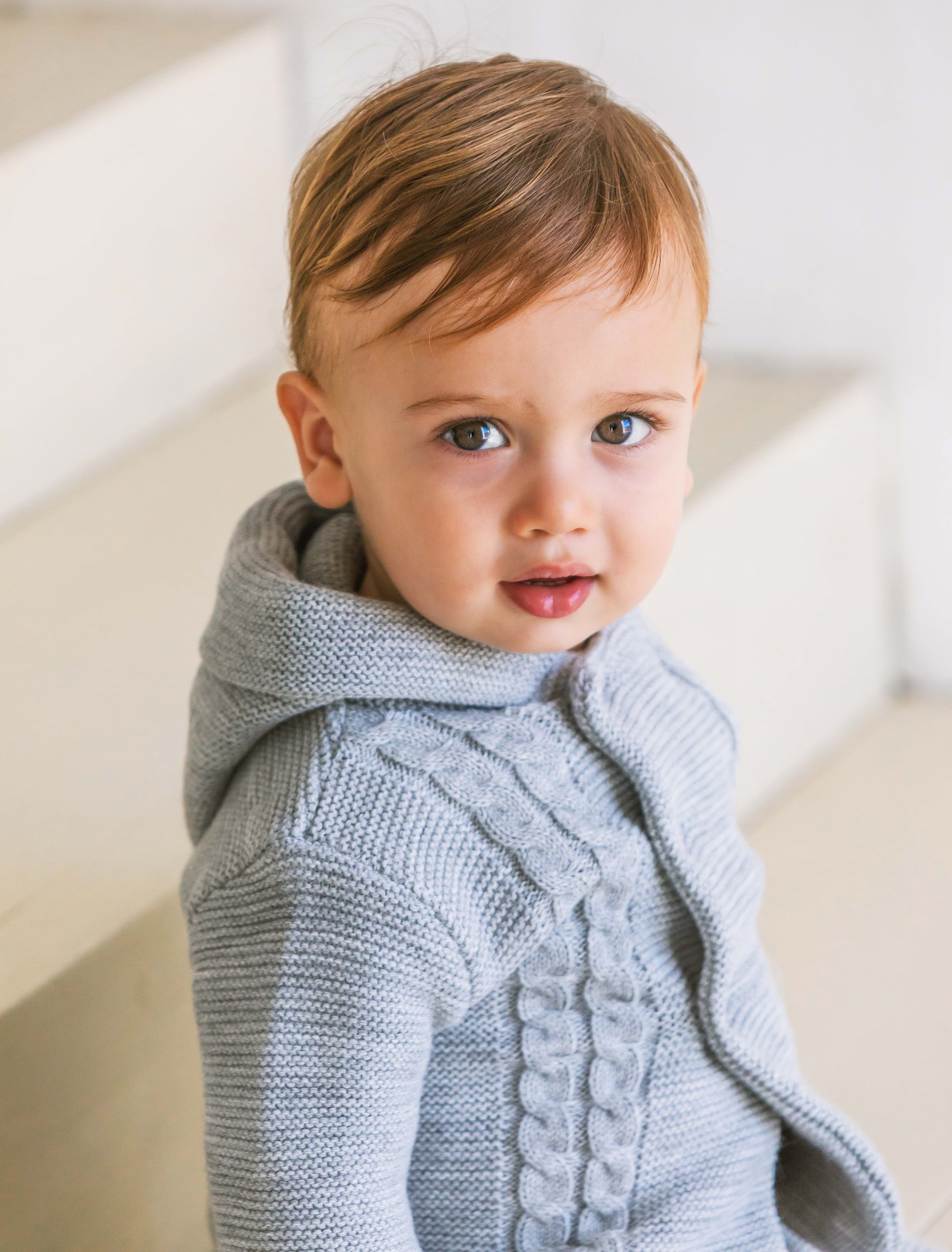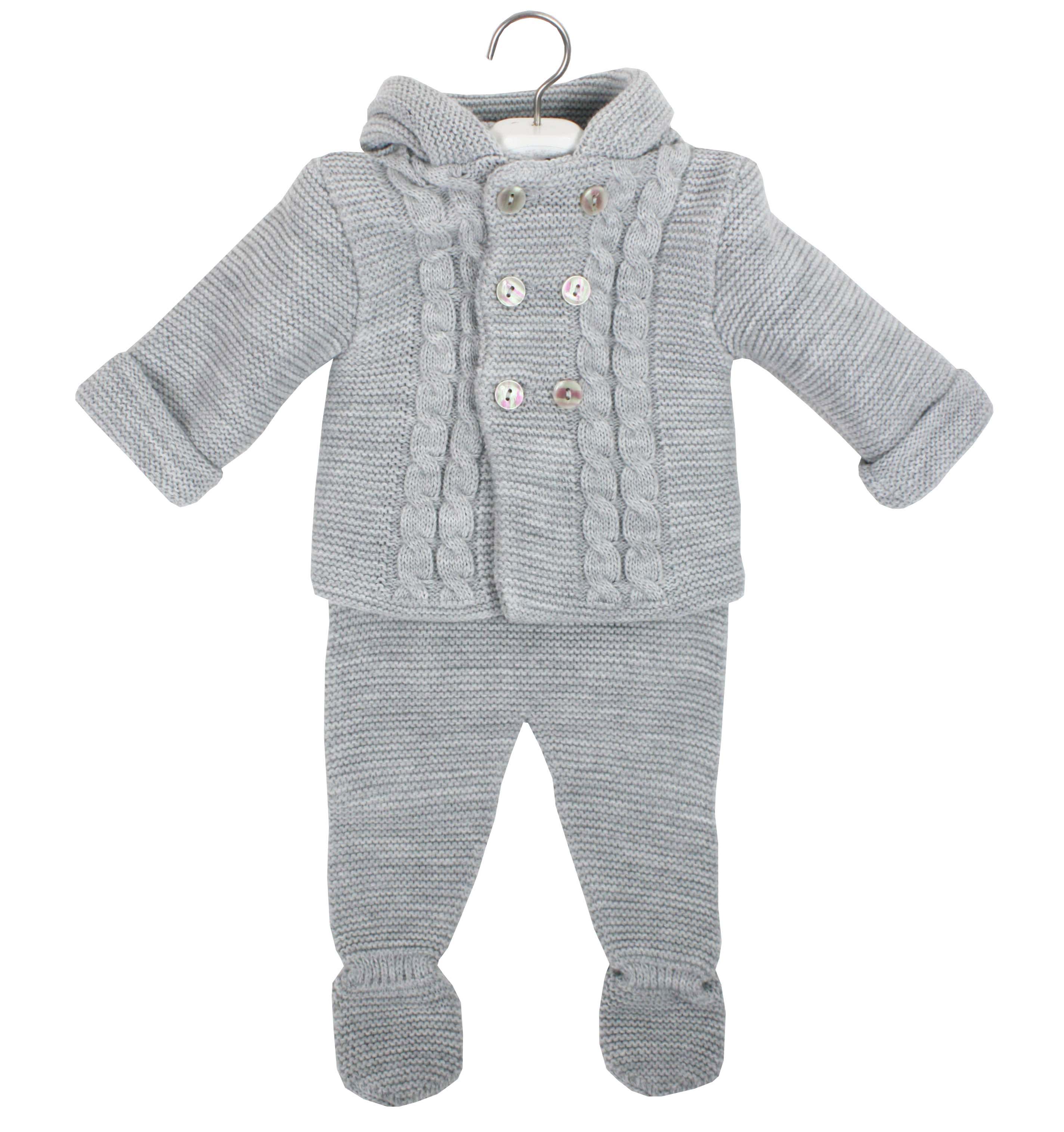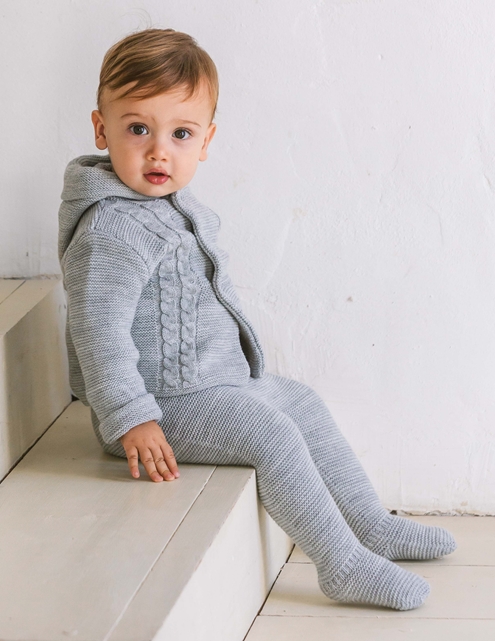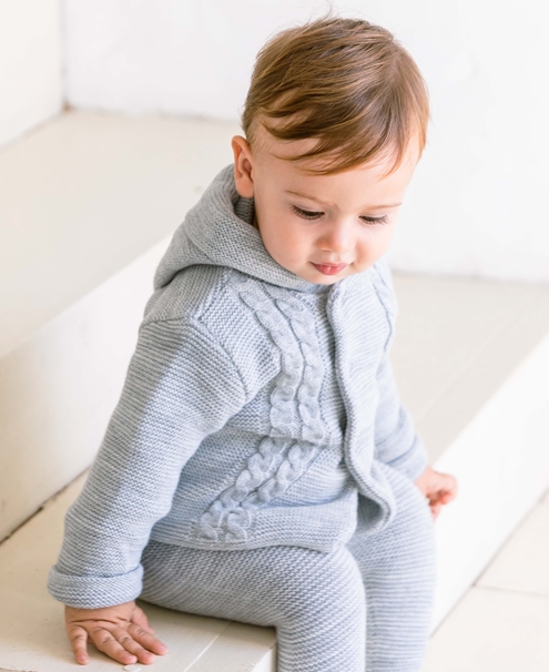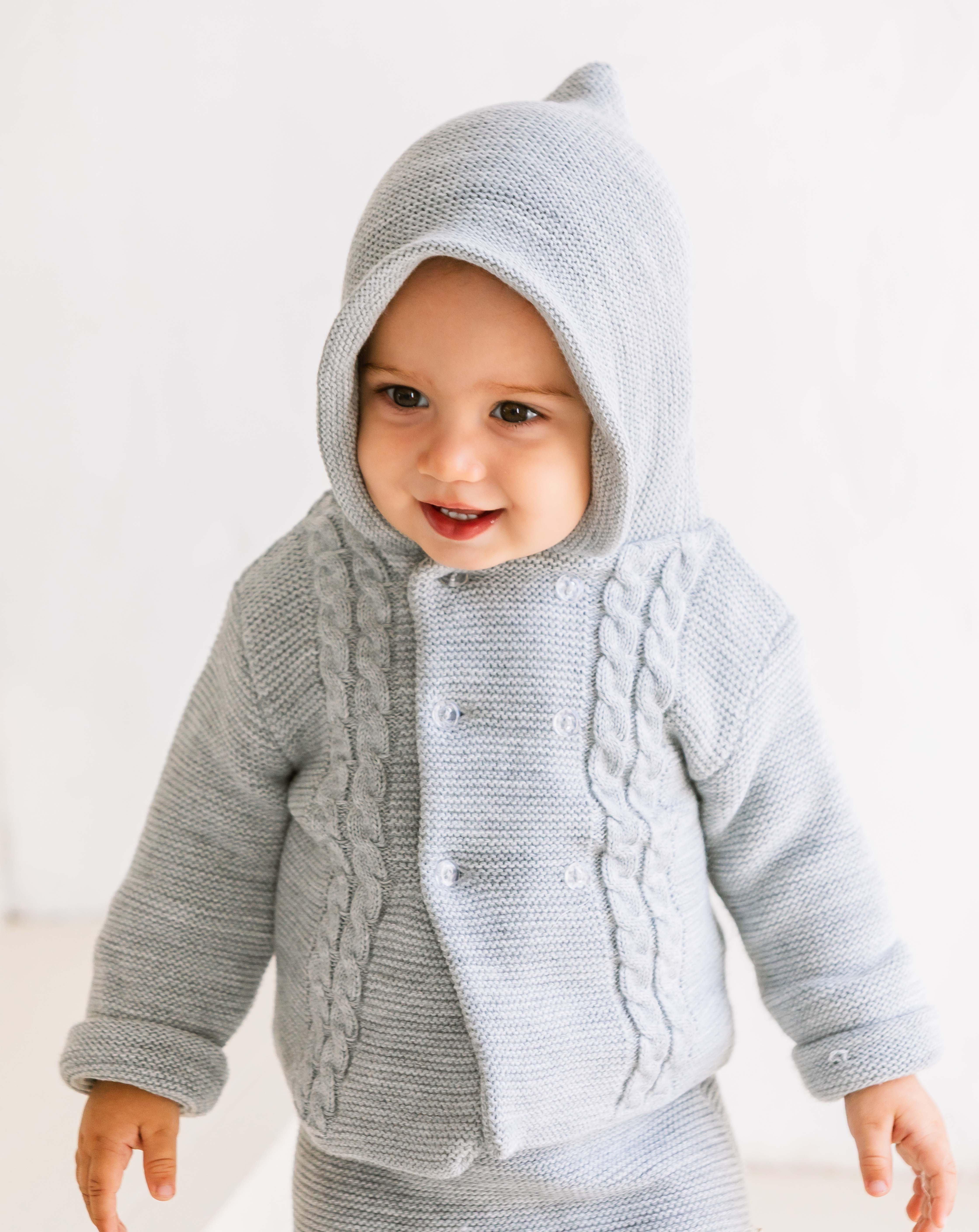 Baby grey cable knit San Francisco for baby. Two pieces, short coat with hood and knitted leggings. Made in Spain