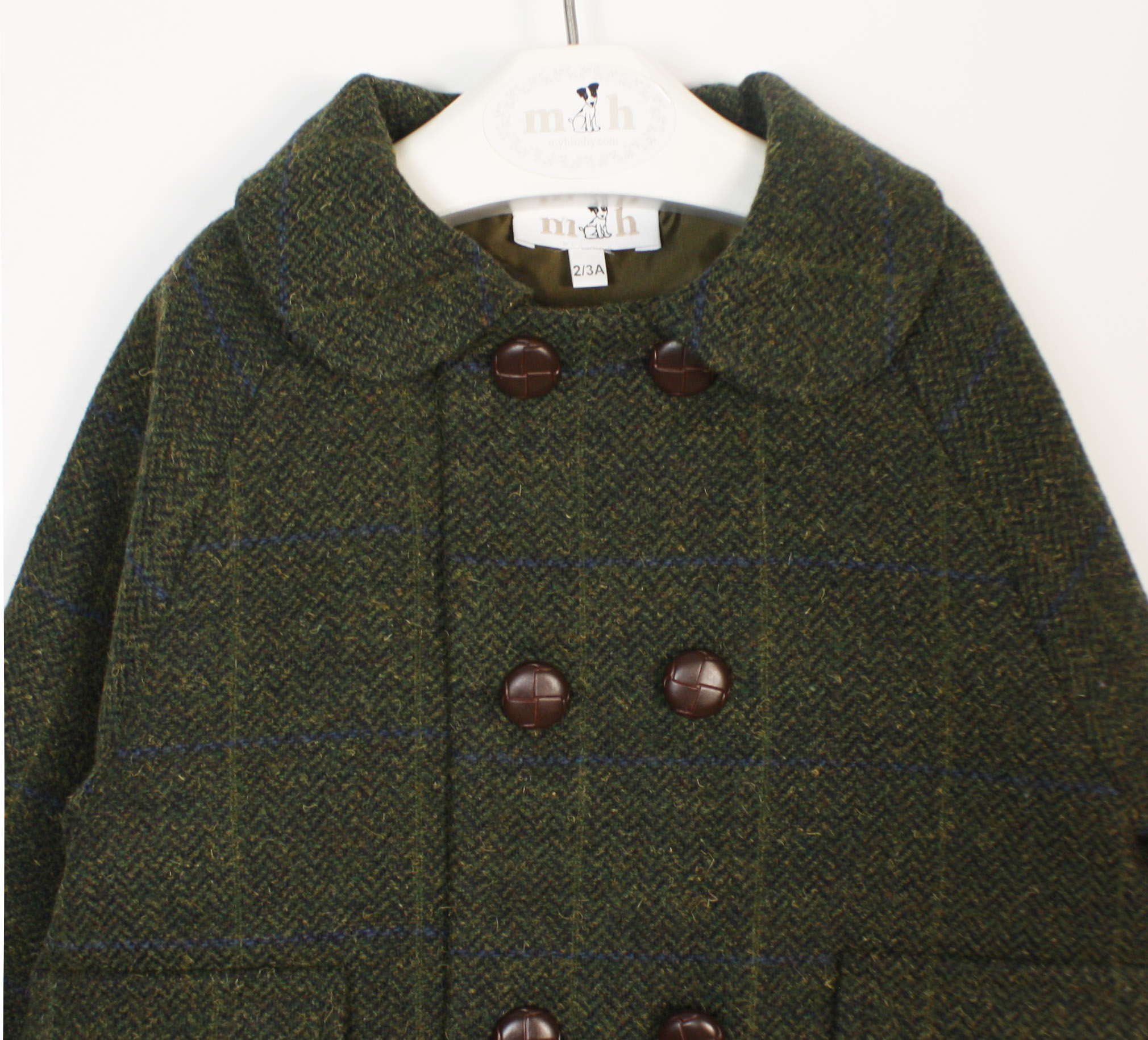 Green double-breasted coat. Buttoned in front. Made in Spain by m&h
