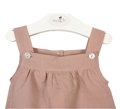 Baby linen romper. Pastel pink. Buttoned back closure, on braces and down.