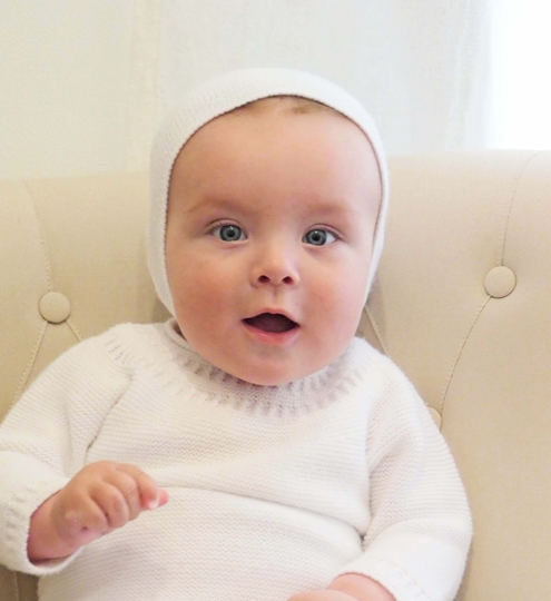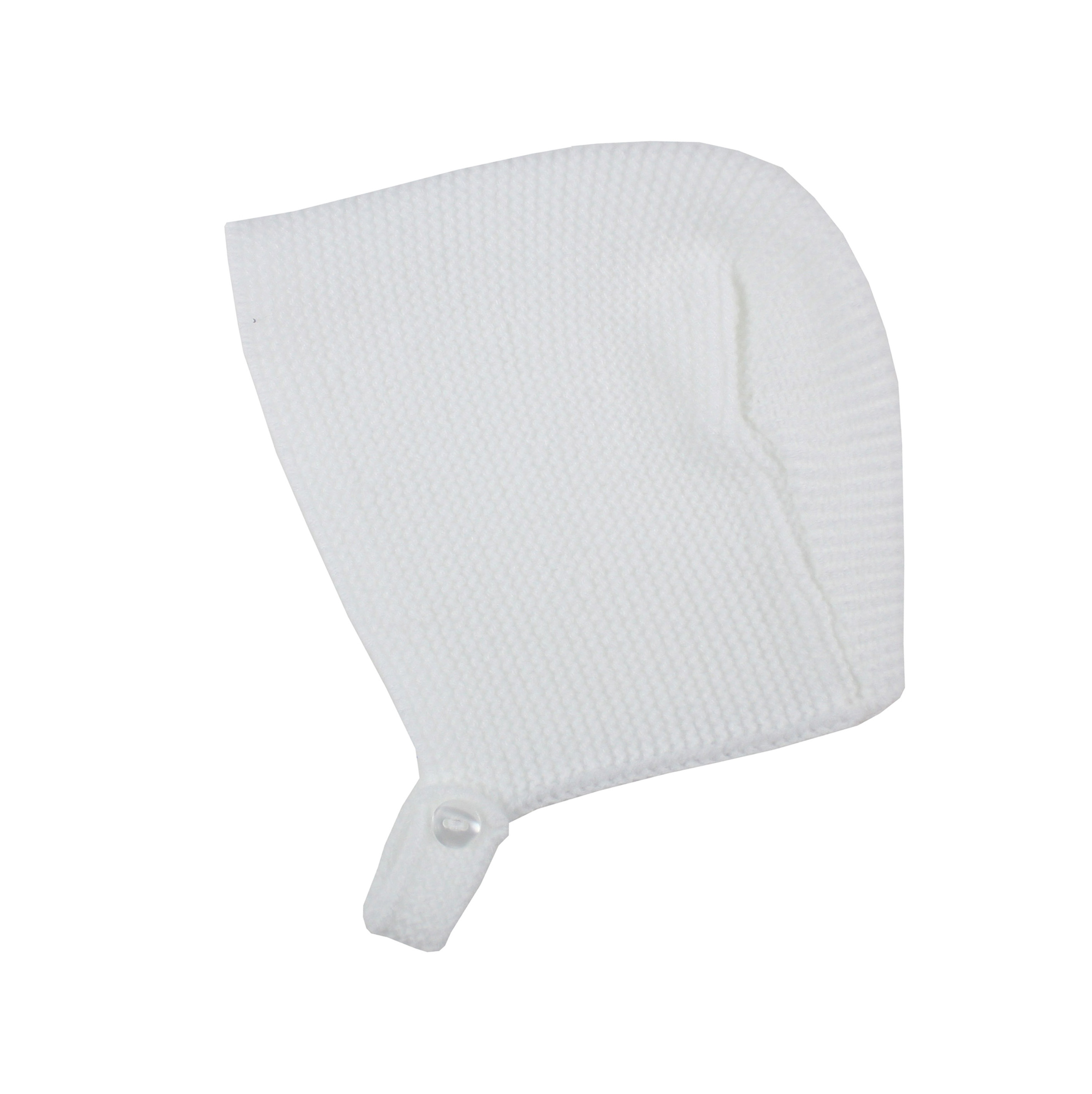 White baby knitted bonnet. Button closure. Made in Spain by m&h