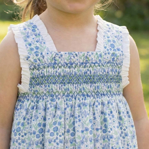 Summer Cádiz dress without sleeves, in cotton with green and blue flowers. Diaper cover up to 2Y. Made in Spain by m&h