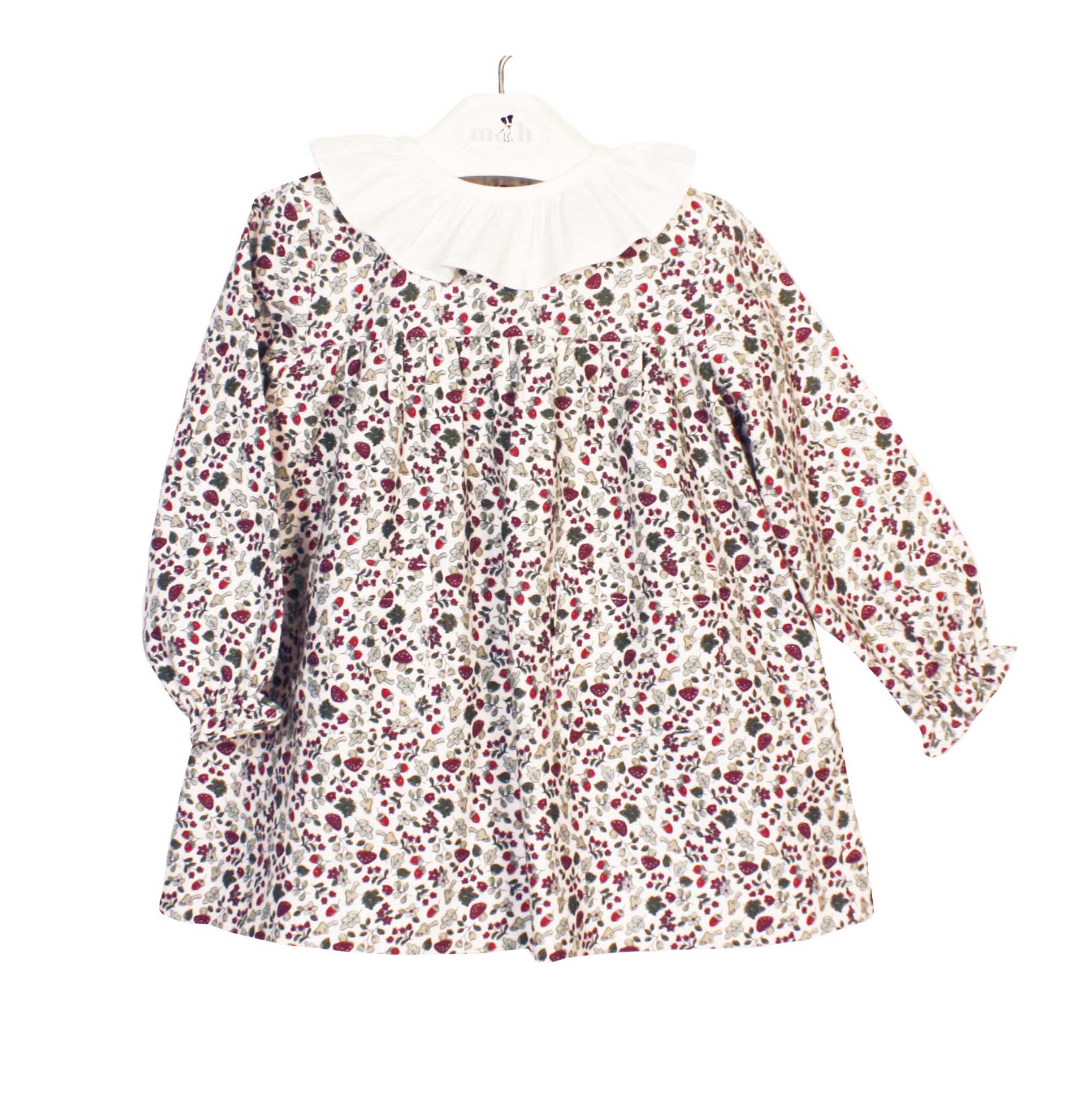 Nuria Christmas baby dress with leaves and mushrooms print. Included diaper cover. Made in Spain by m&h.