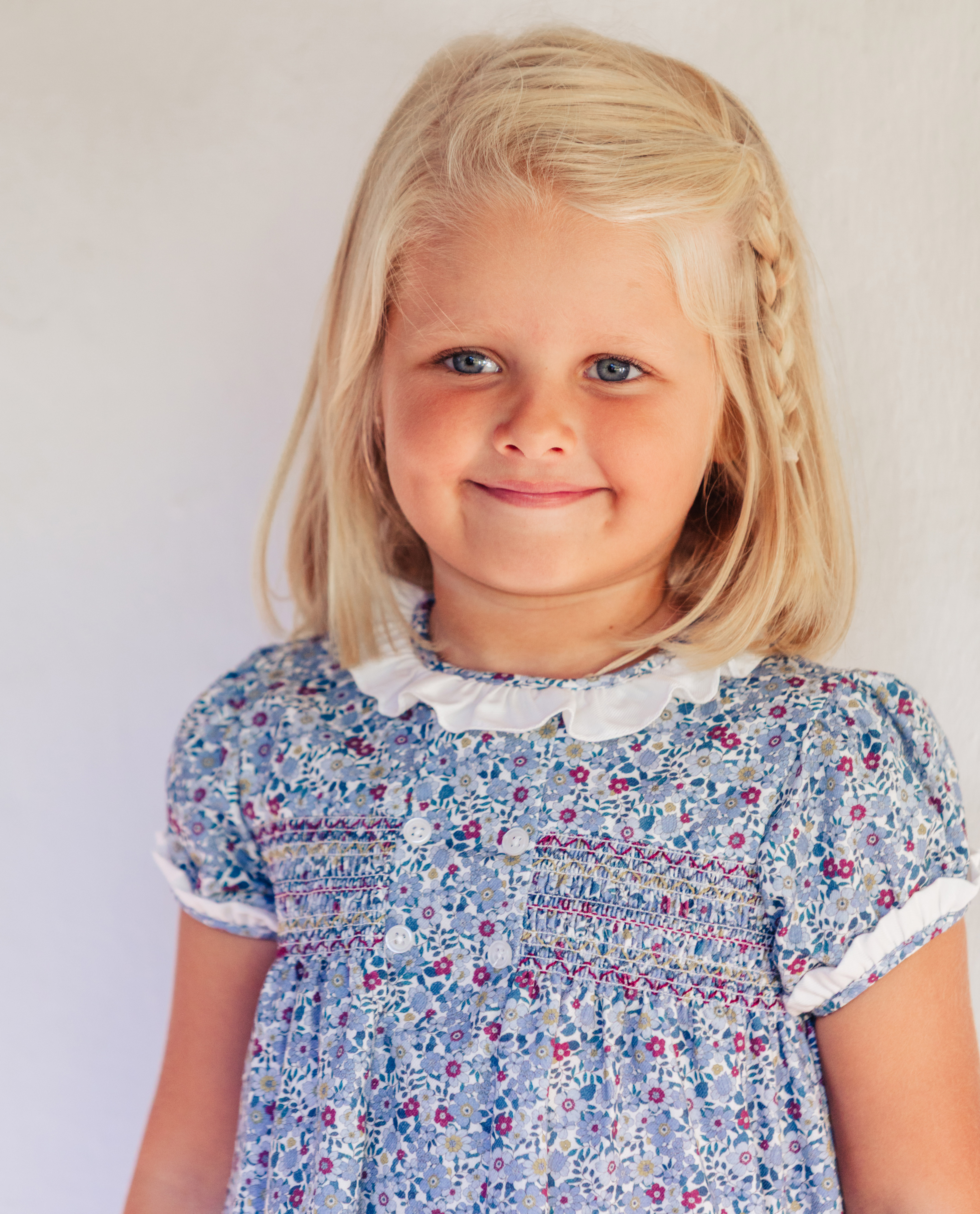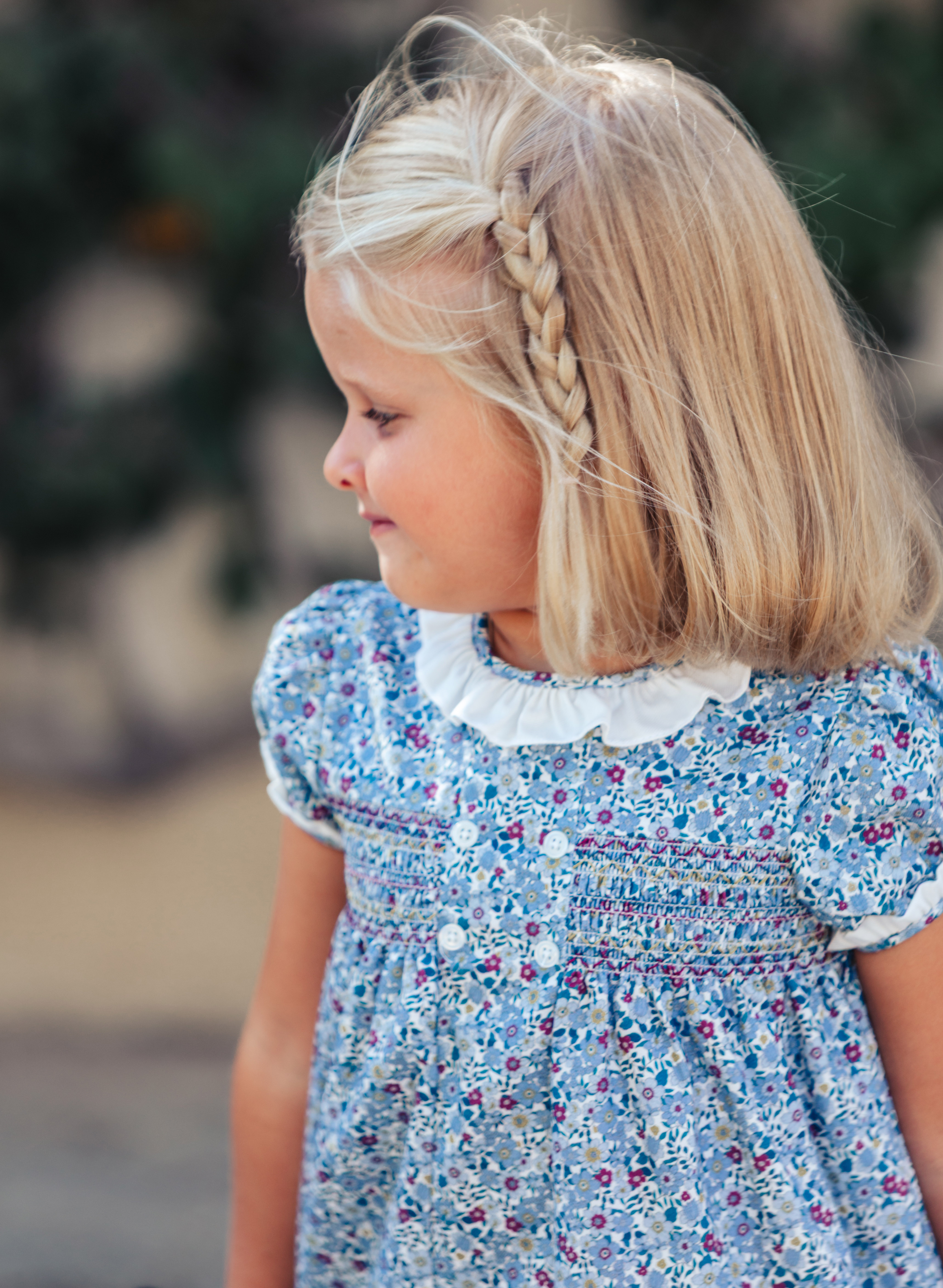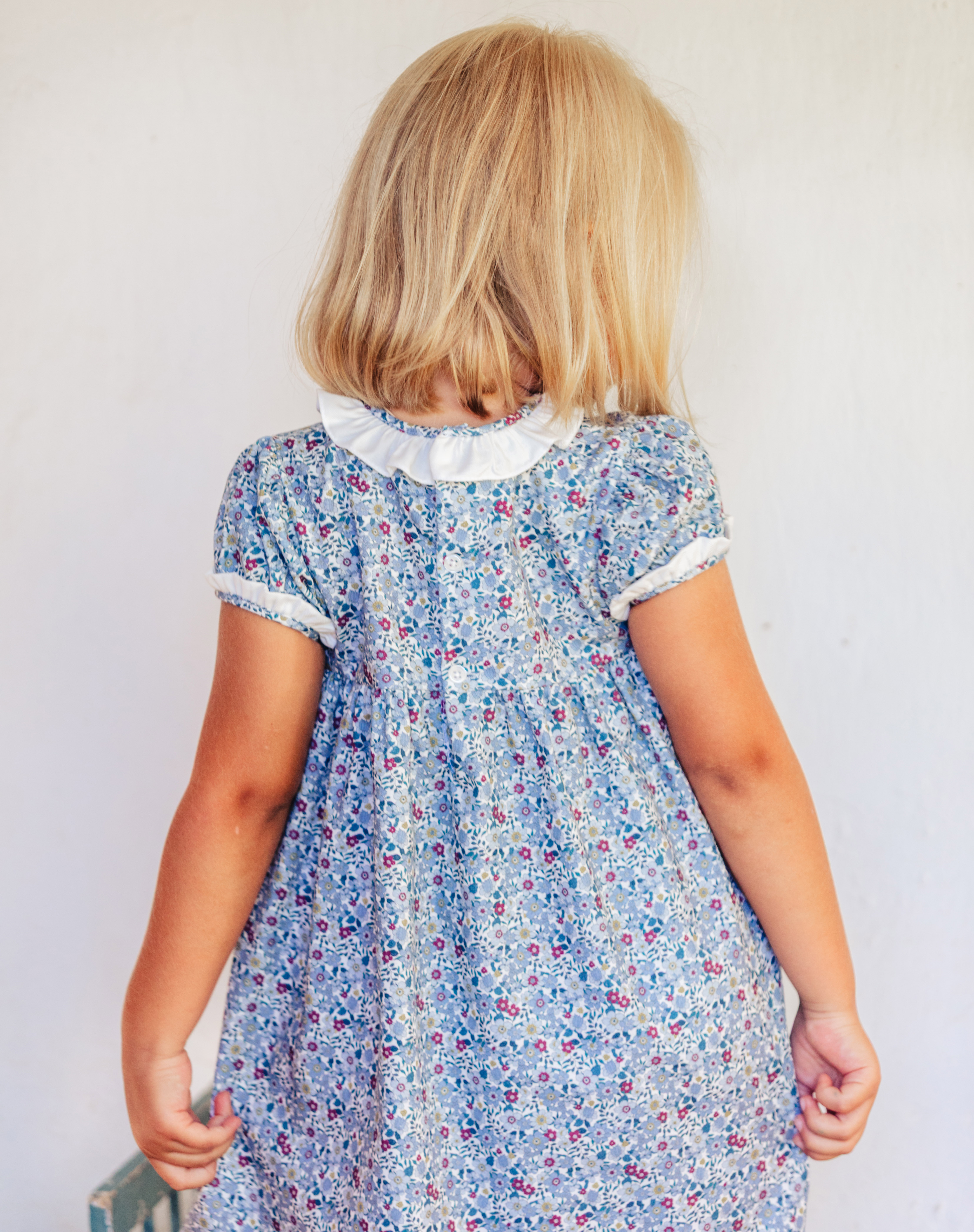 Inés dress blue-bell print. Made in Spain by m&h. Diaper cover up to 2Y