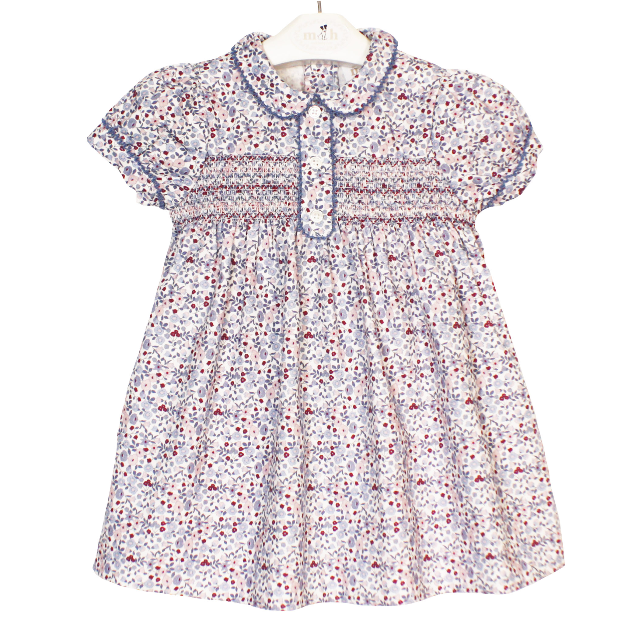 Elisa dress. Blue, pink and burgundy print. Diaper cover up to 2Y. Made in Spain by m&h