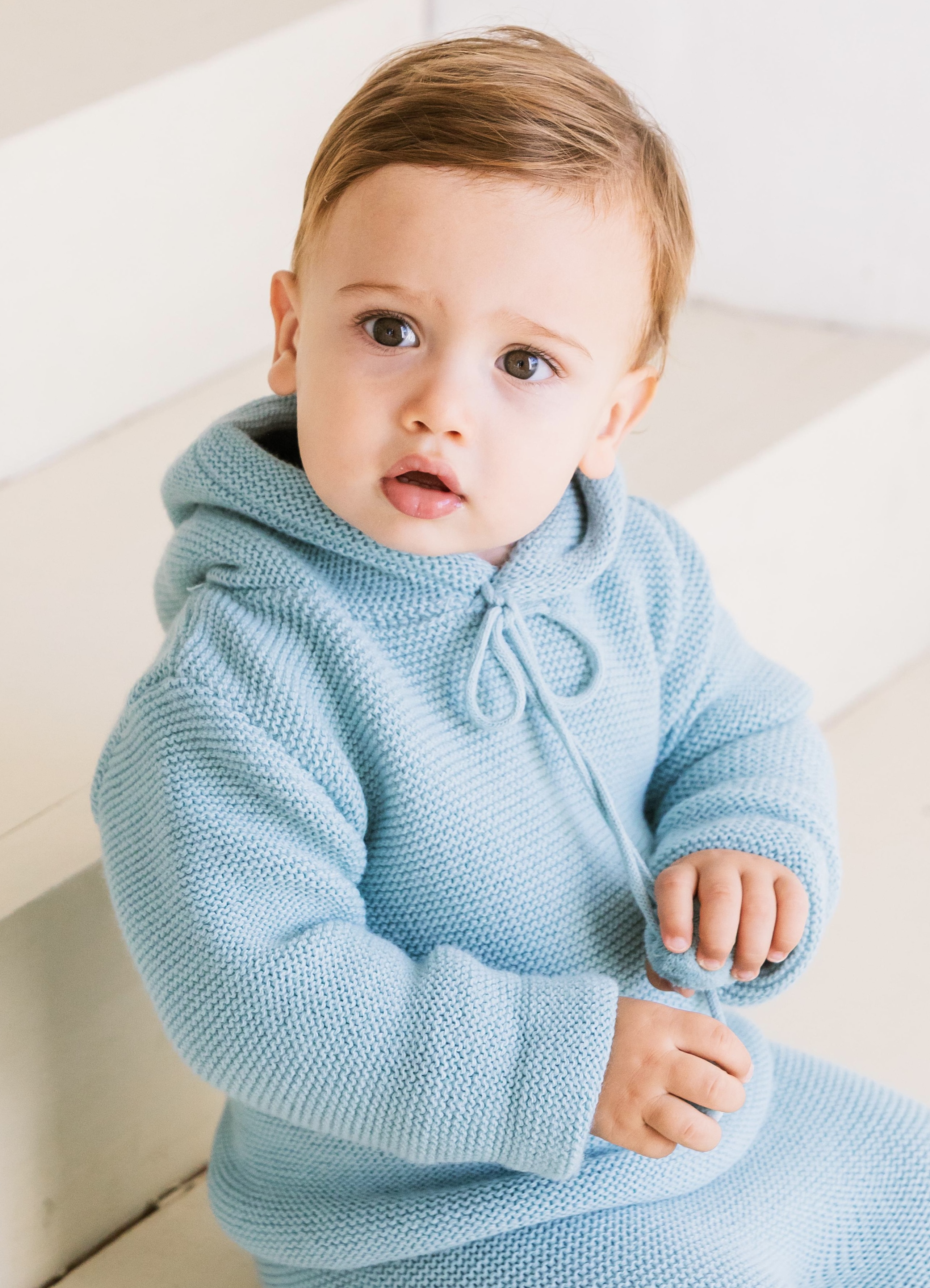 Green San Francisco with pompom. Two pieces, short coat with hood and knitted leggings.
