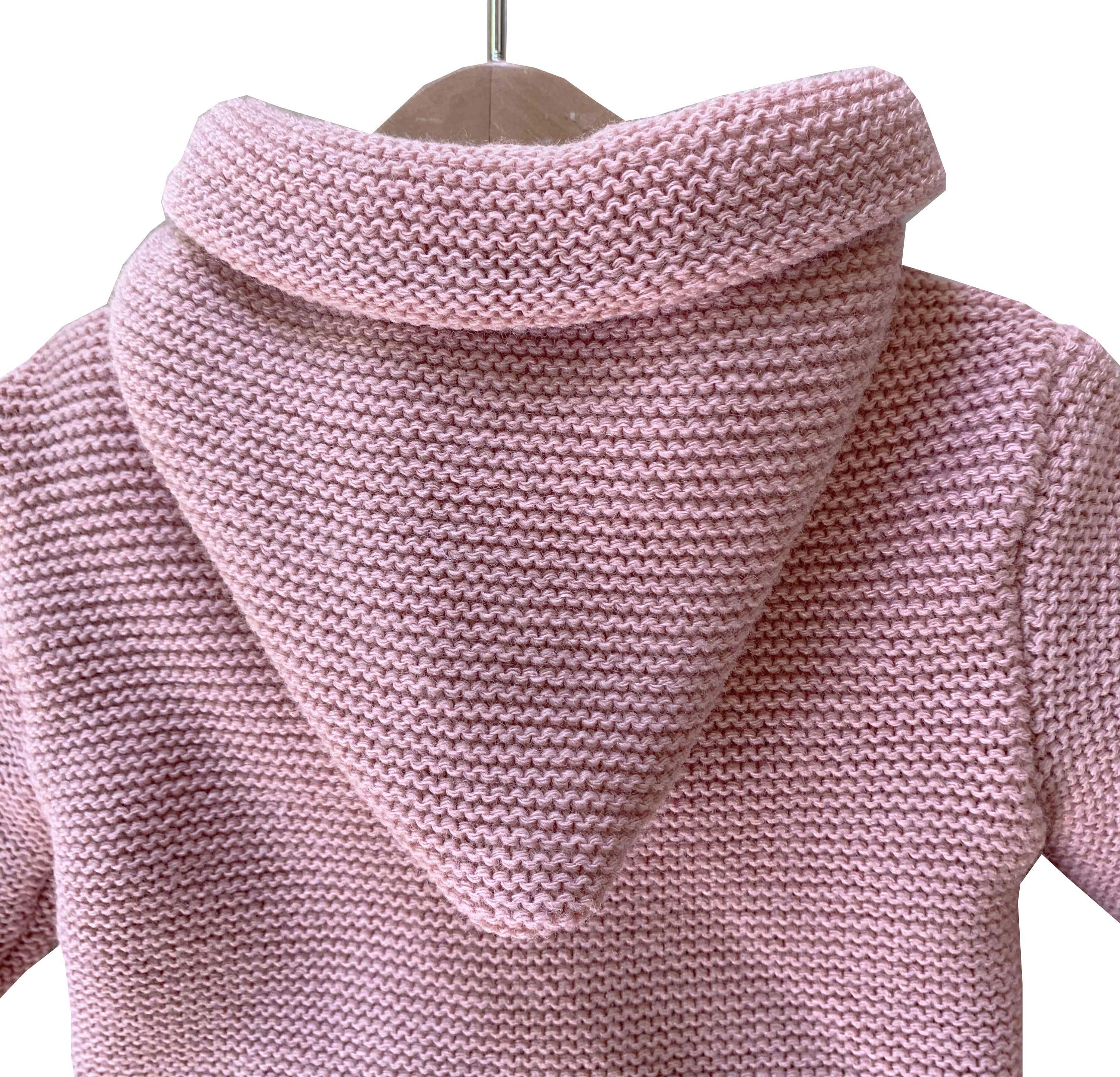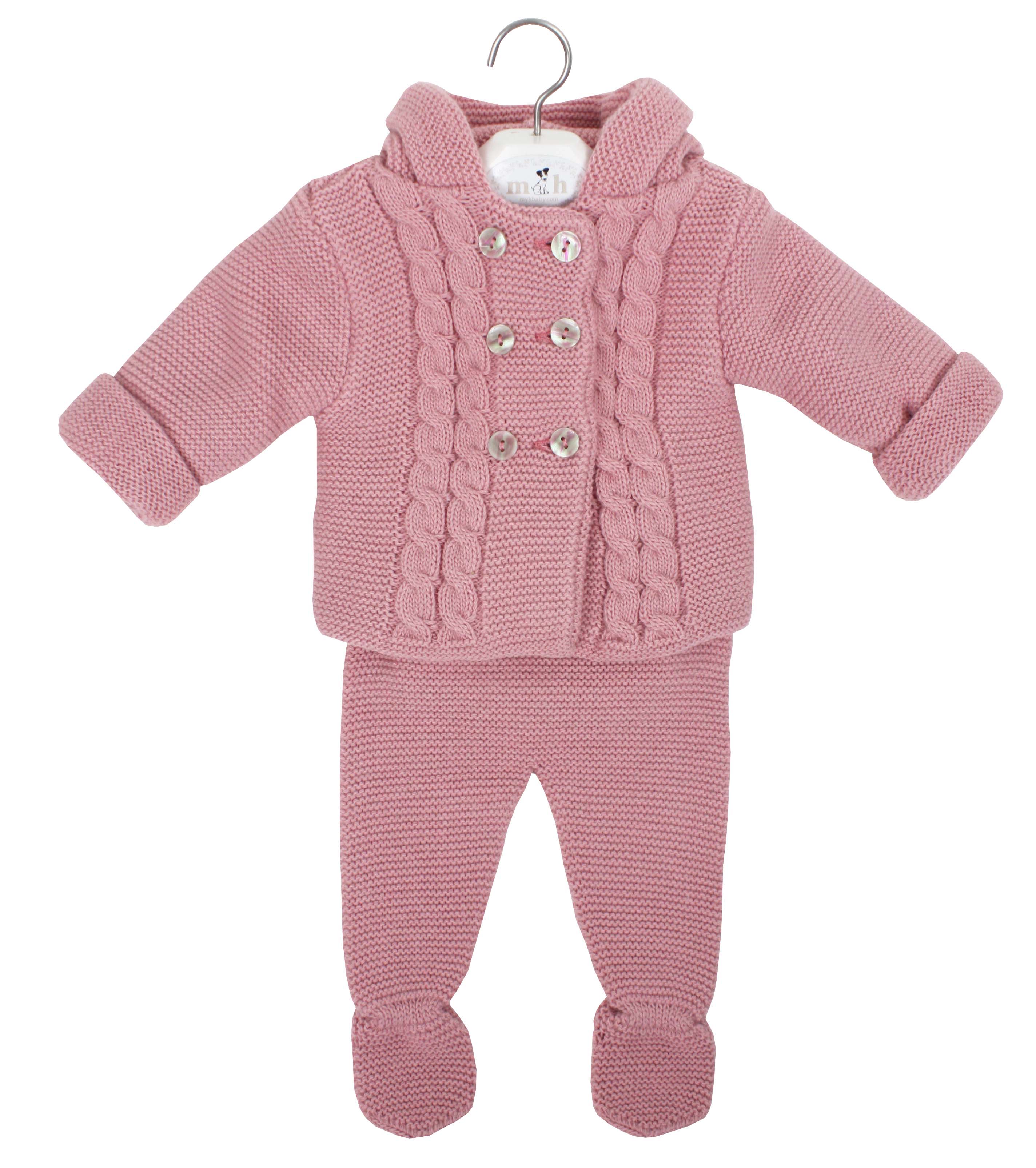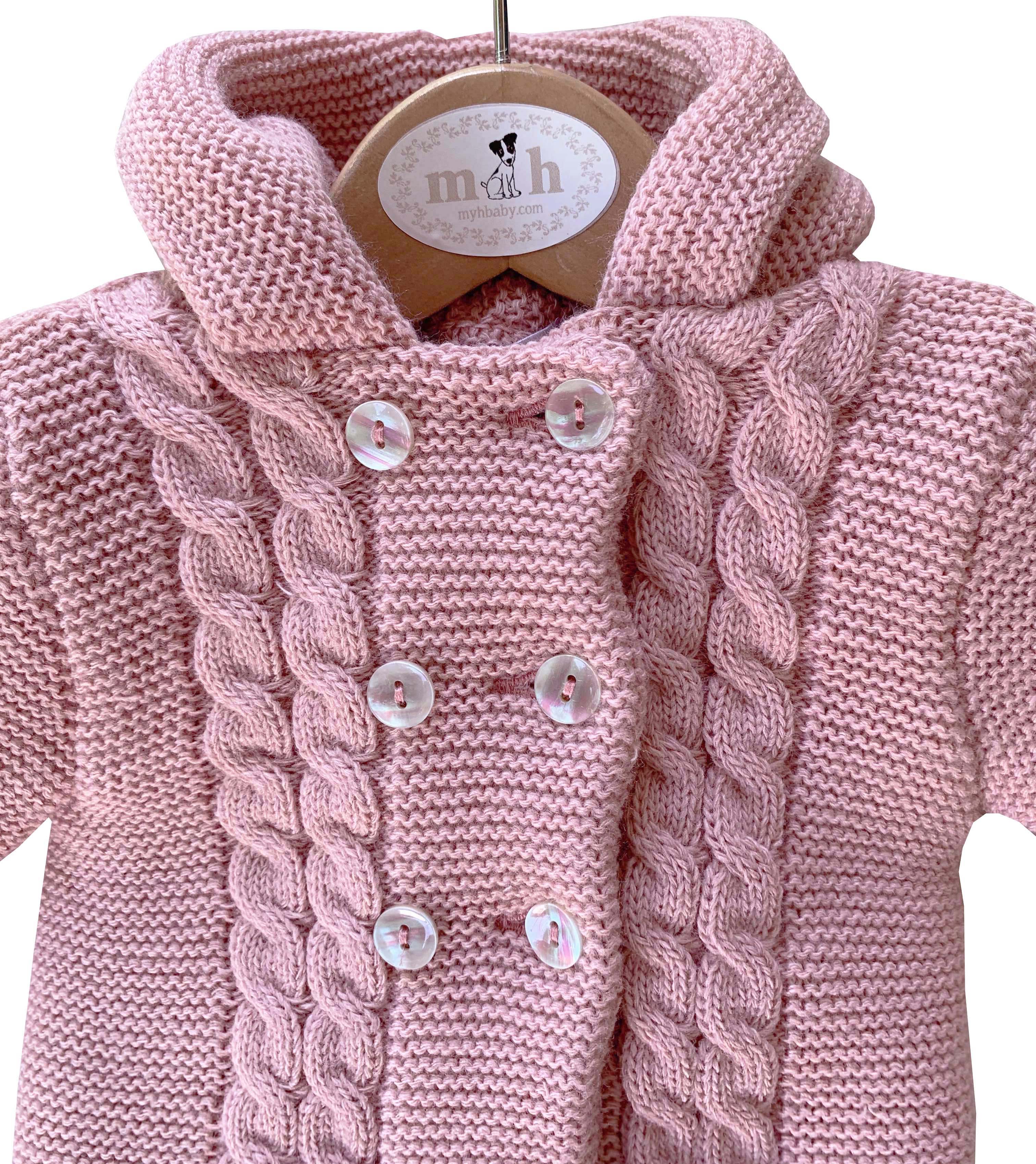 Baby pastel pink cable knit San Francisco. Two pieces, short coat with hood and knitted leggings. Made in Spain