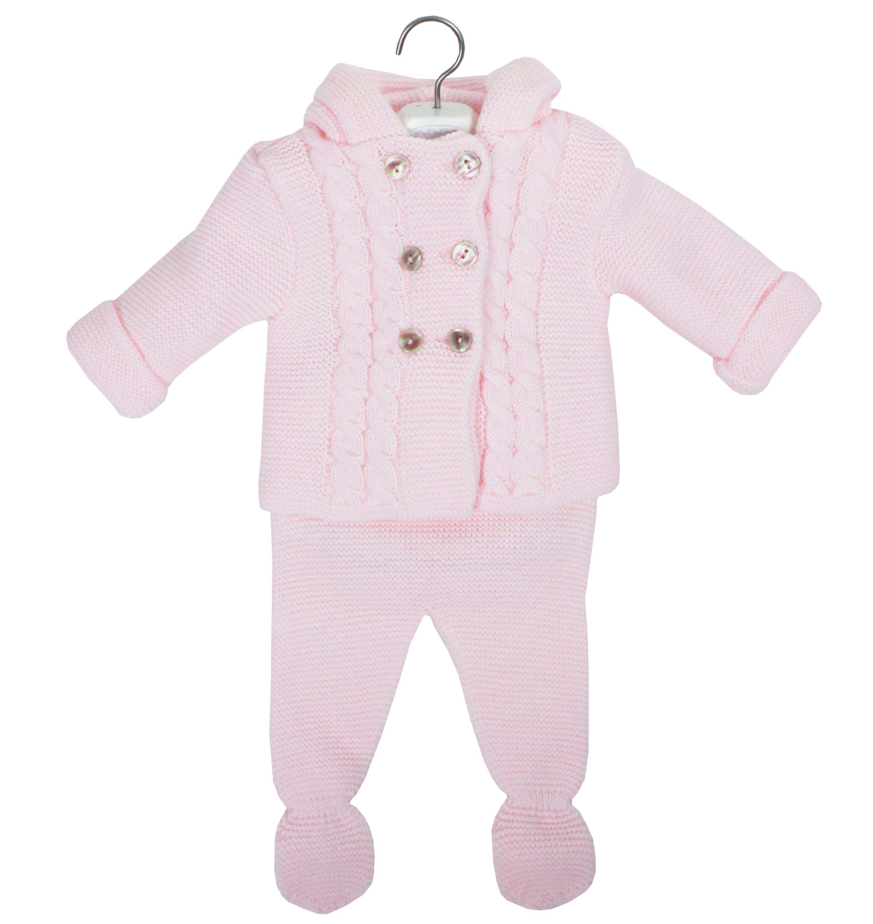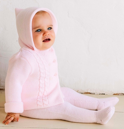 Baby pink cable knit San Francisco. Two pieces, short coat with hood and knitted leggings.