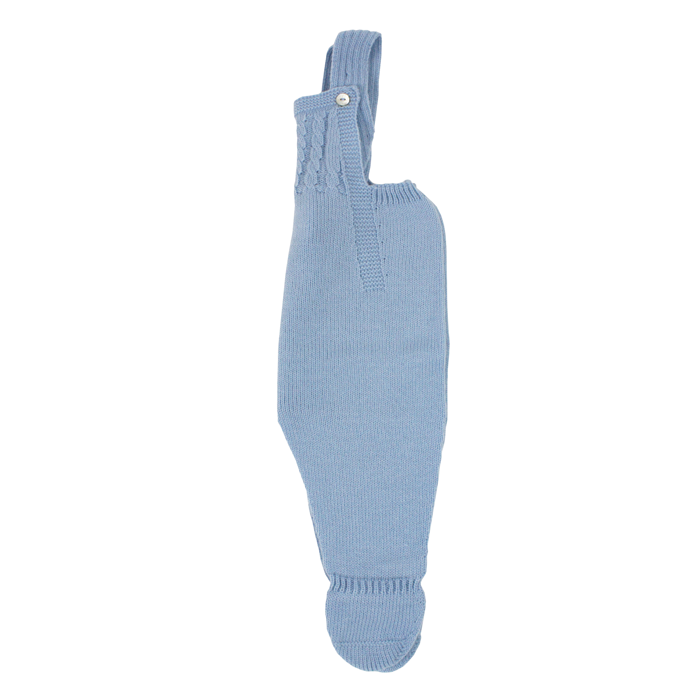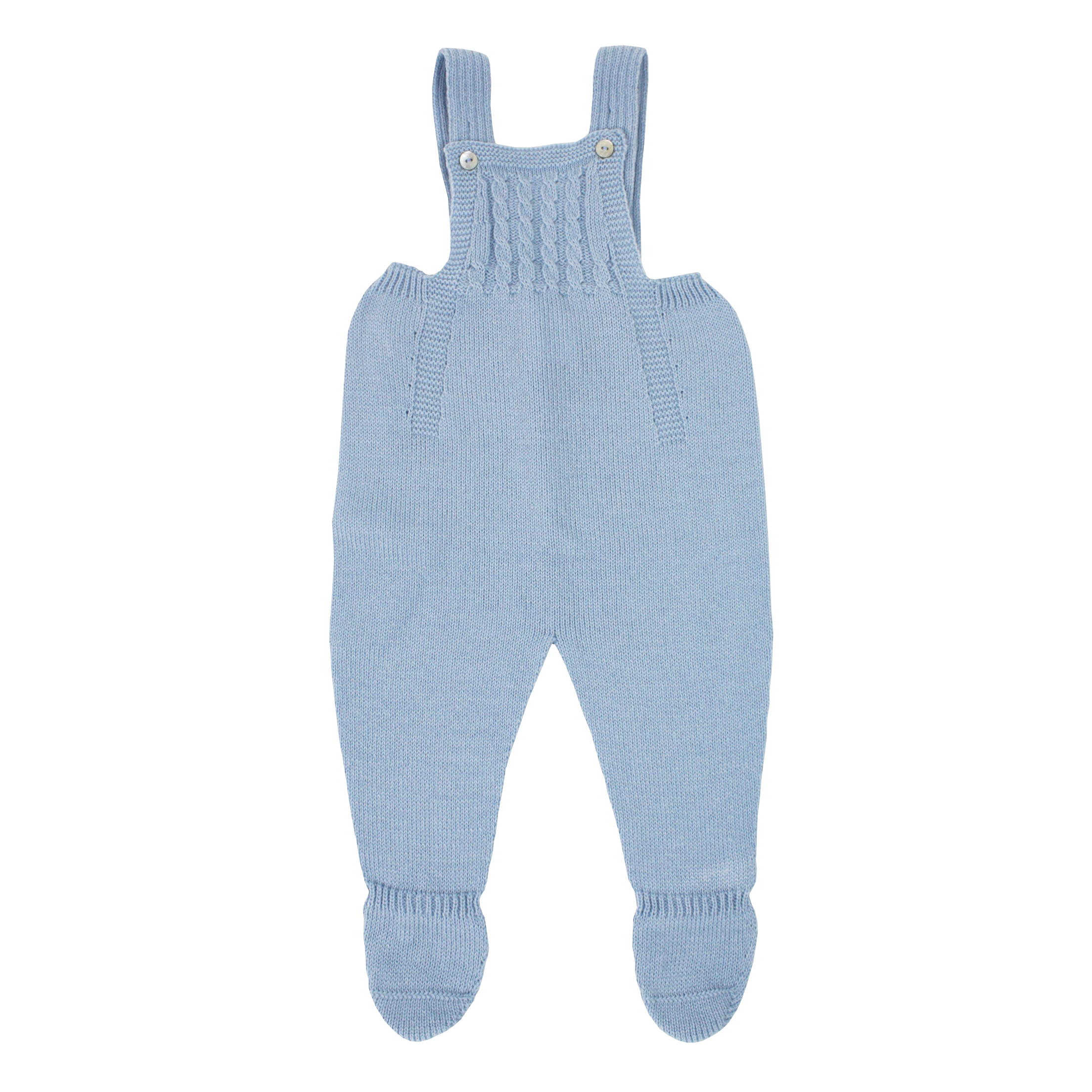 Blue knit baby dungaree. Button closure on braces. Made in Spain by m&h
