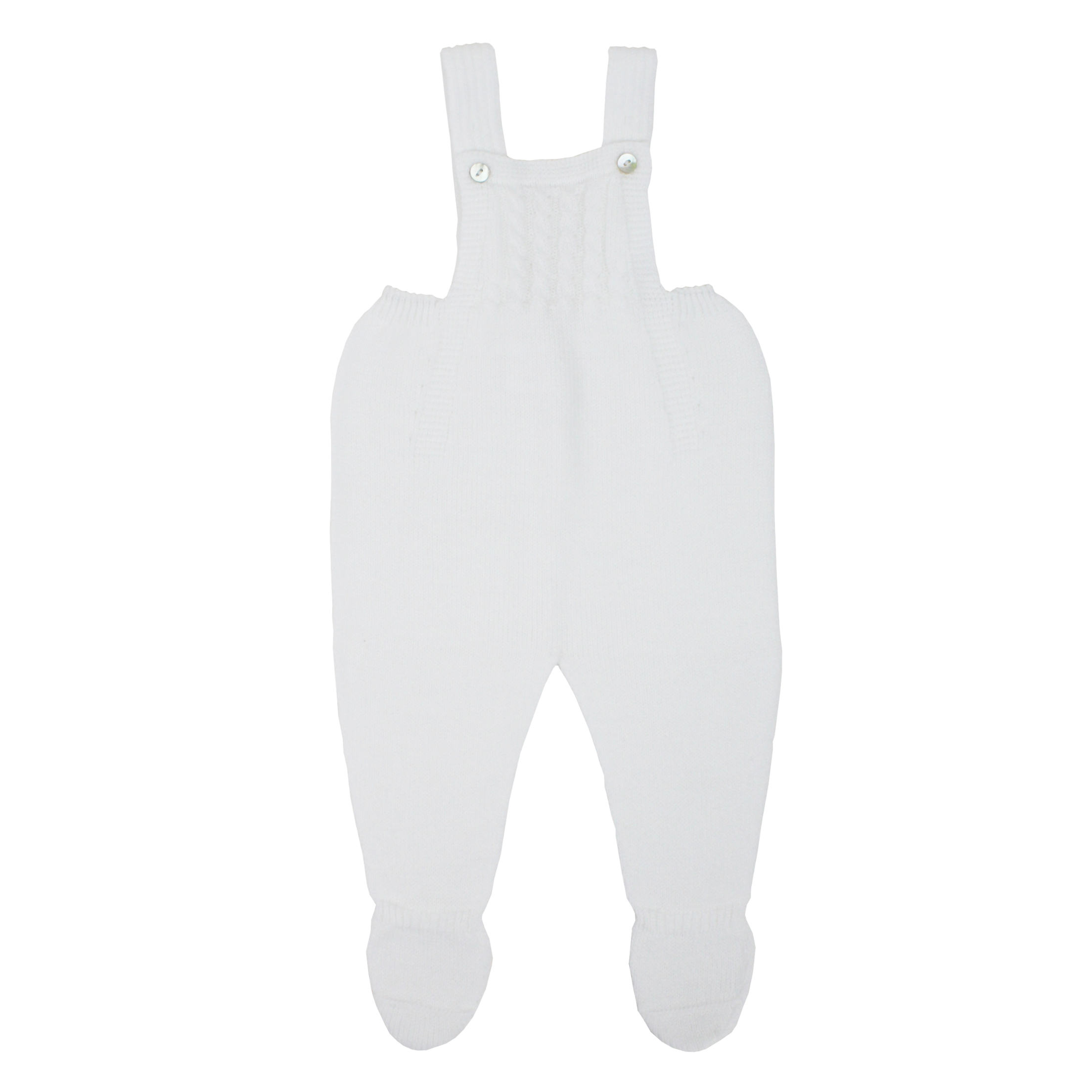 White knit baby dungaree with braces. Buttons closure in braces. Made in Spain by m&h