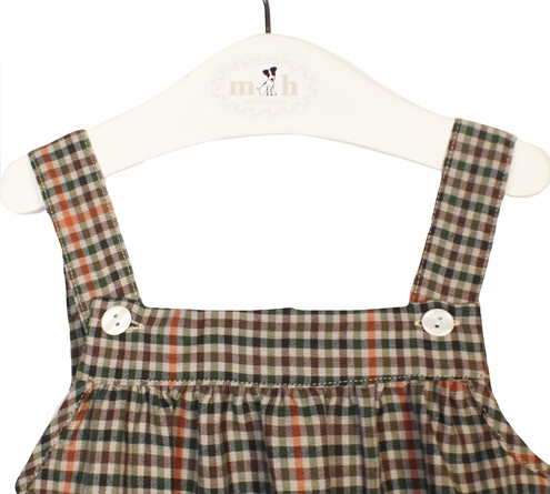 Harris pattern romper m&h in brown, camel, burgundy and blue.