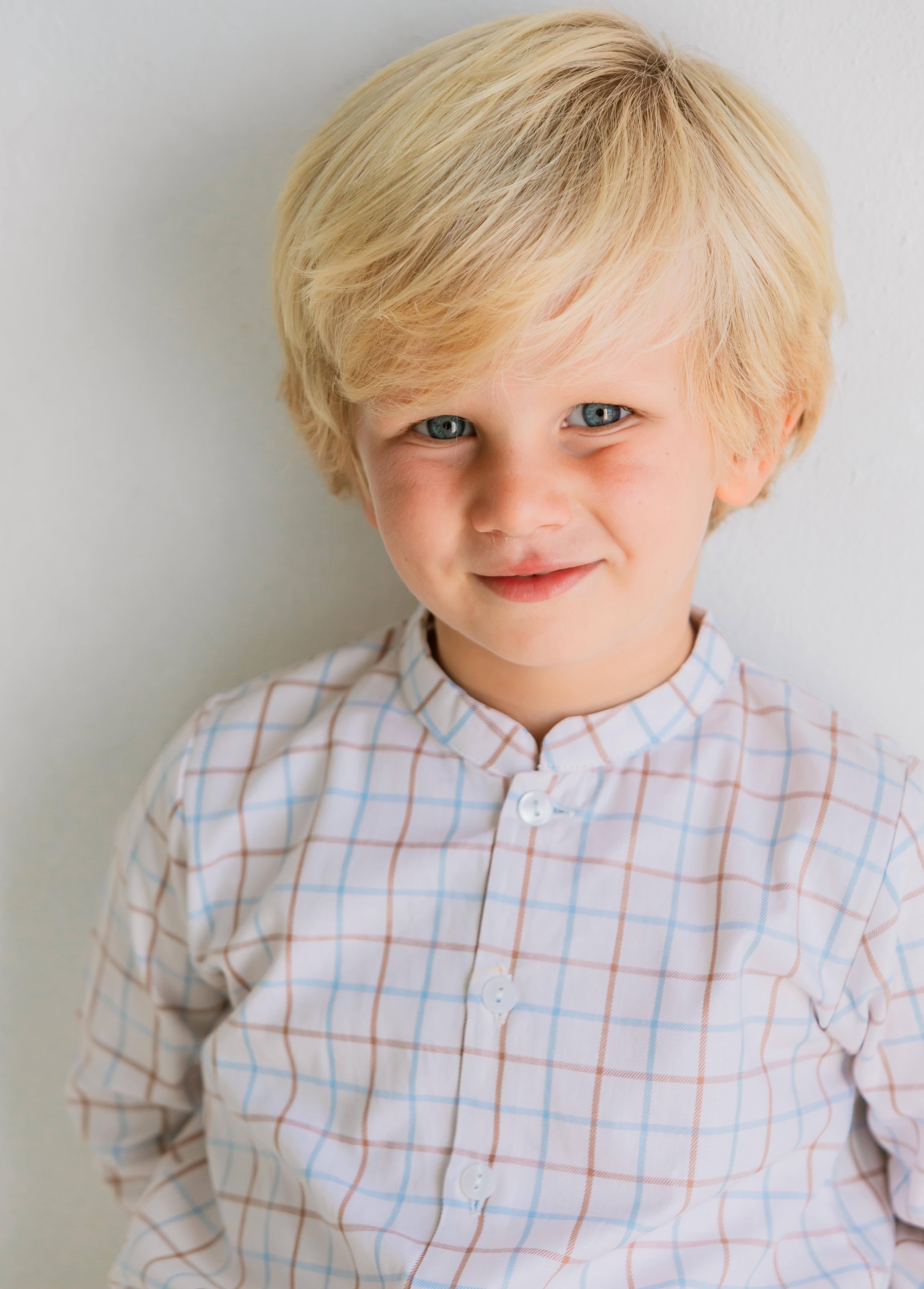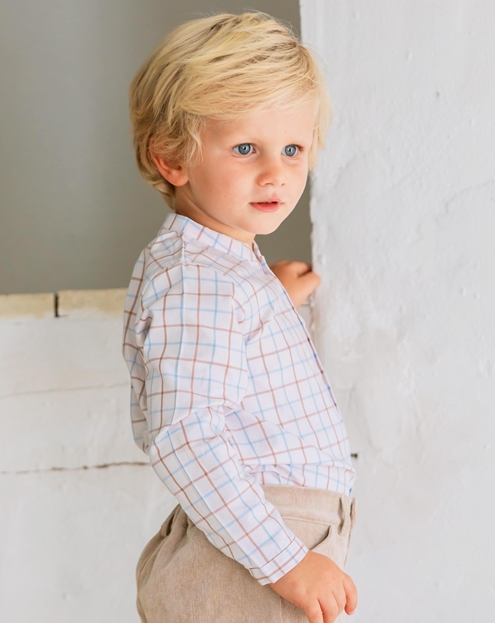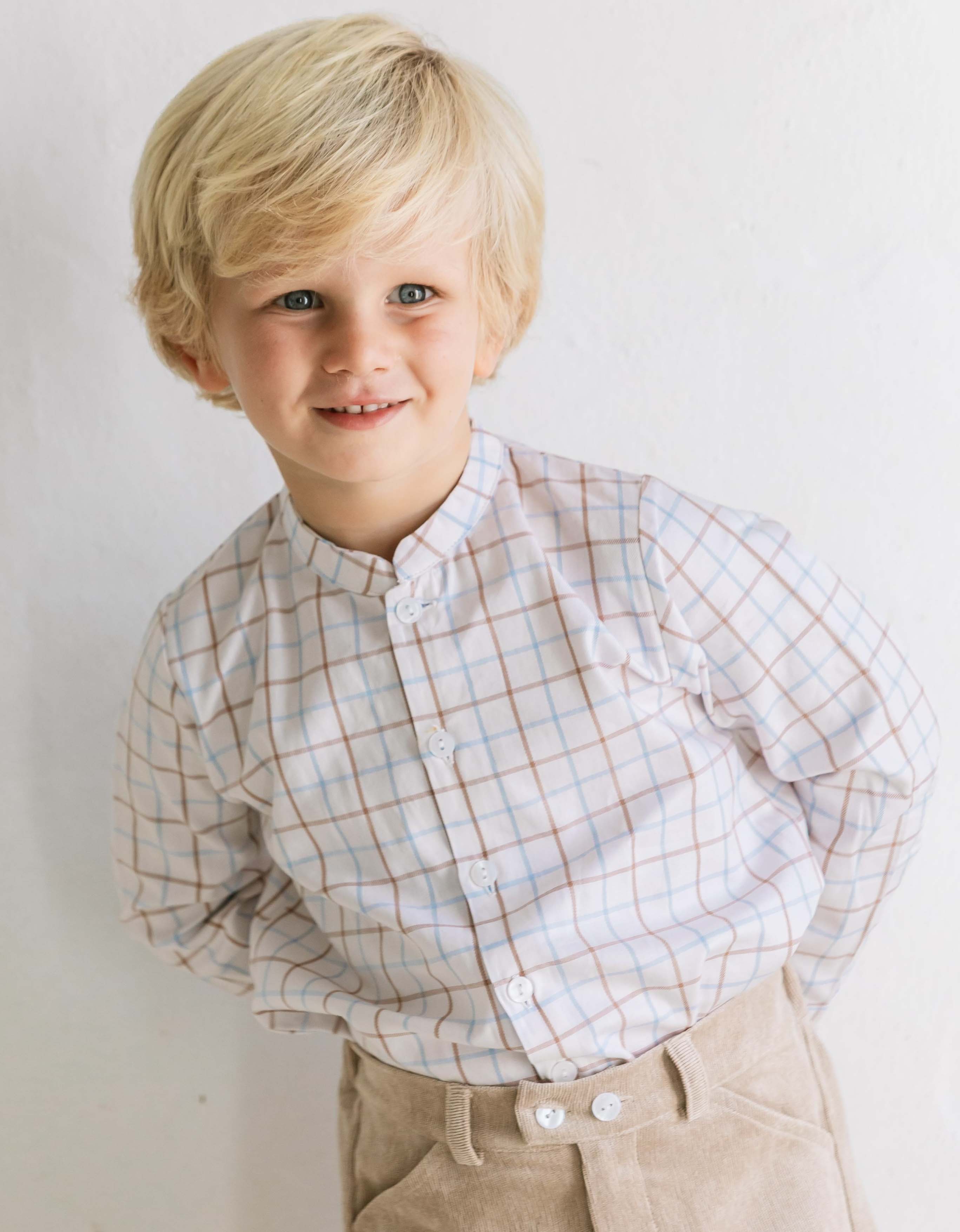 Long sleeve boy shirt with mao collar, in sand and blue plaid print.