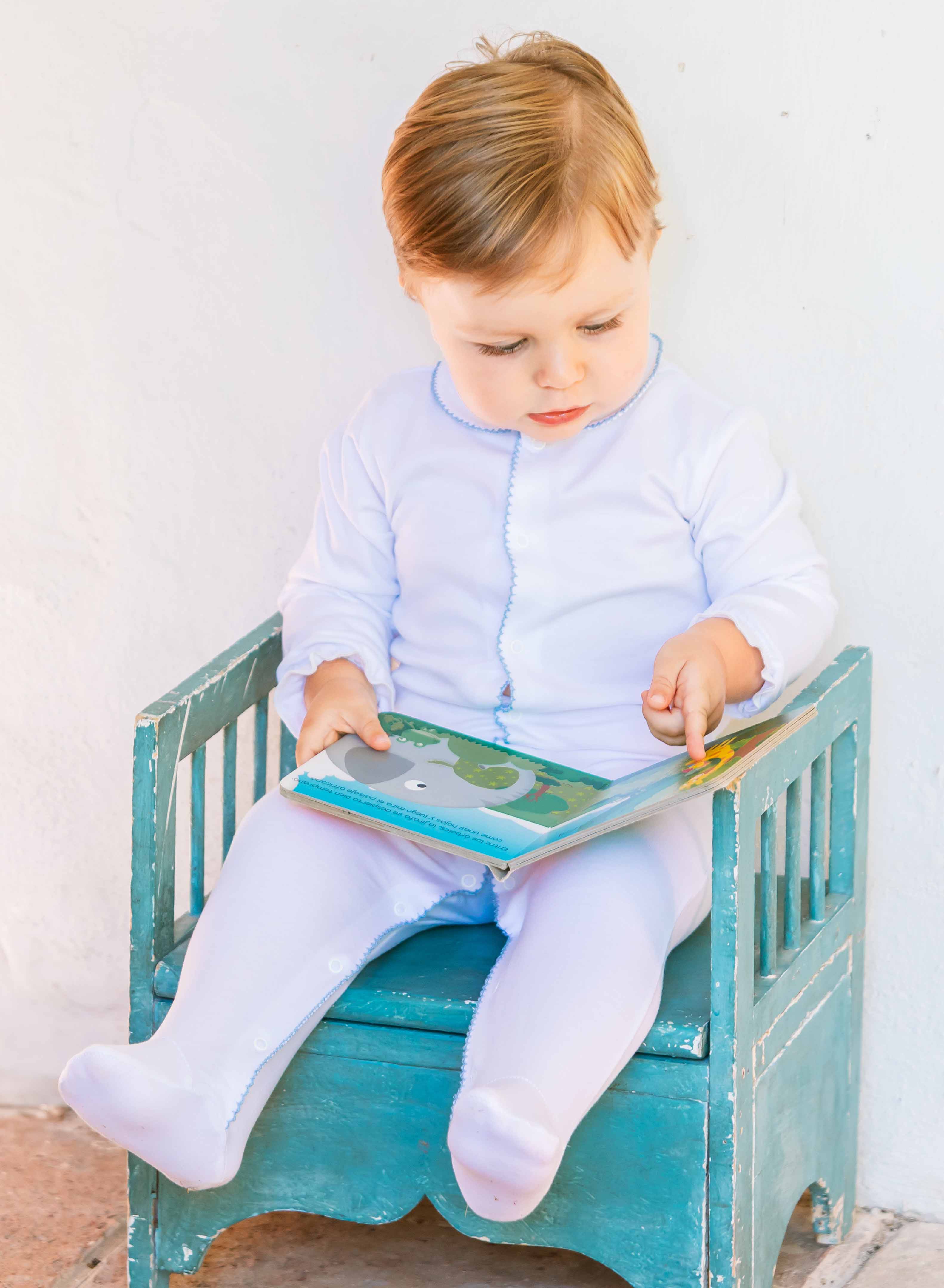 m&h sleepsuit in white and blue stitch