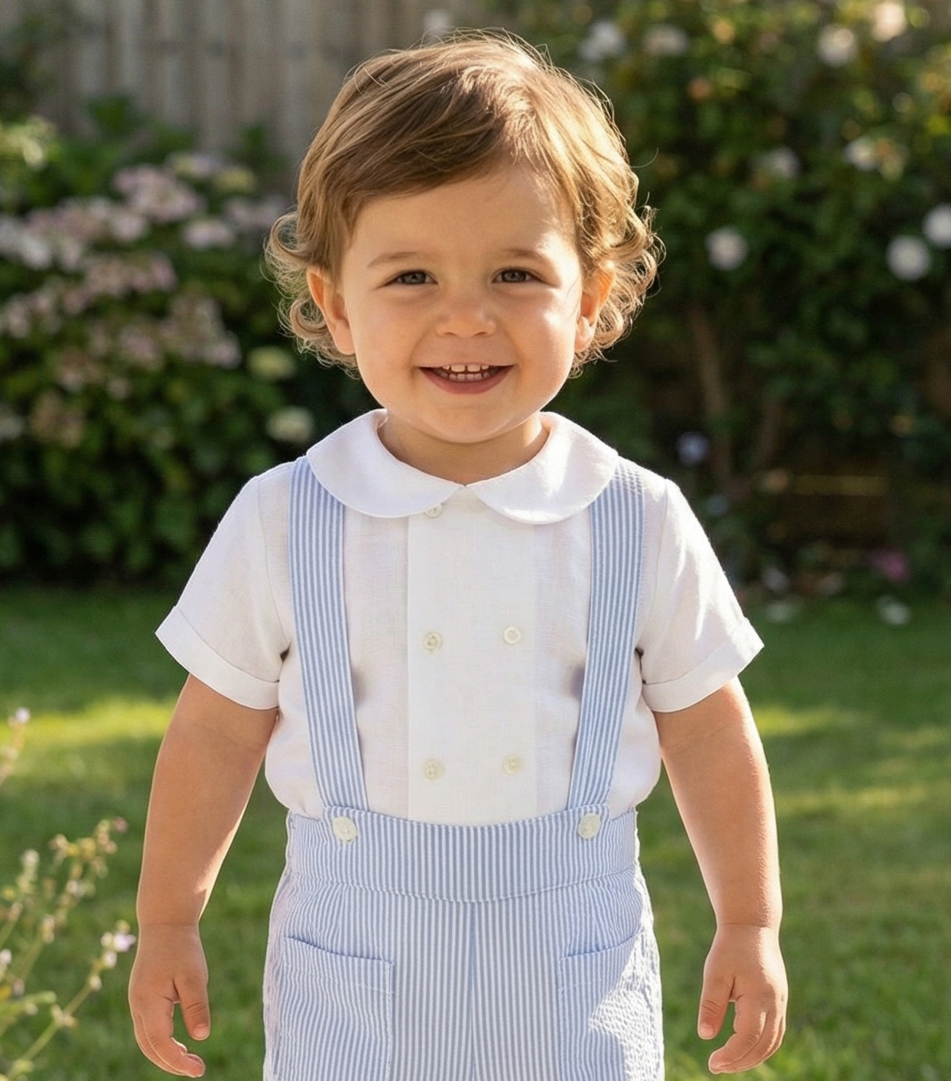 Look bermuda con tirante rayaz azules, camisa blanca de lino manga corta y loneta azul celeste