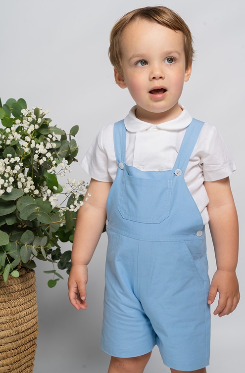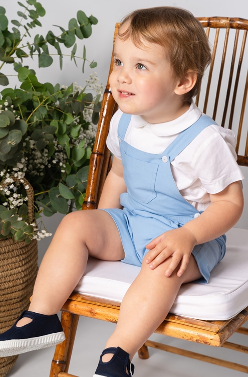 Peto corto de algodón en tono azulón. Detalle de bolsillo frontal, 2 laterales y 2 traseros. Botones en contraste.