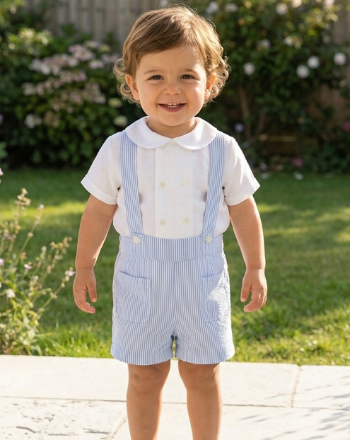Bermuda de niño con tirante. Estampado rayas azules y blancas. Bolsillos delanteros y goma trasera.