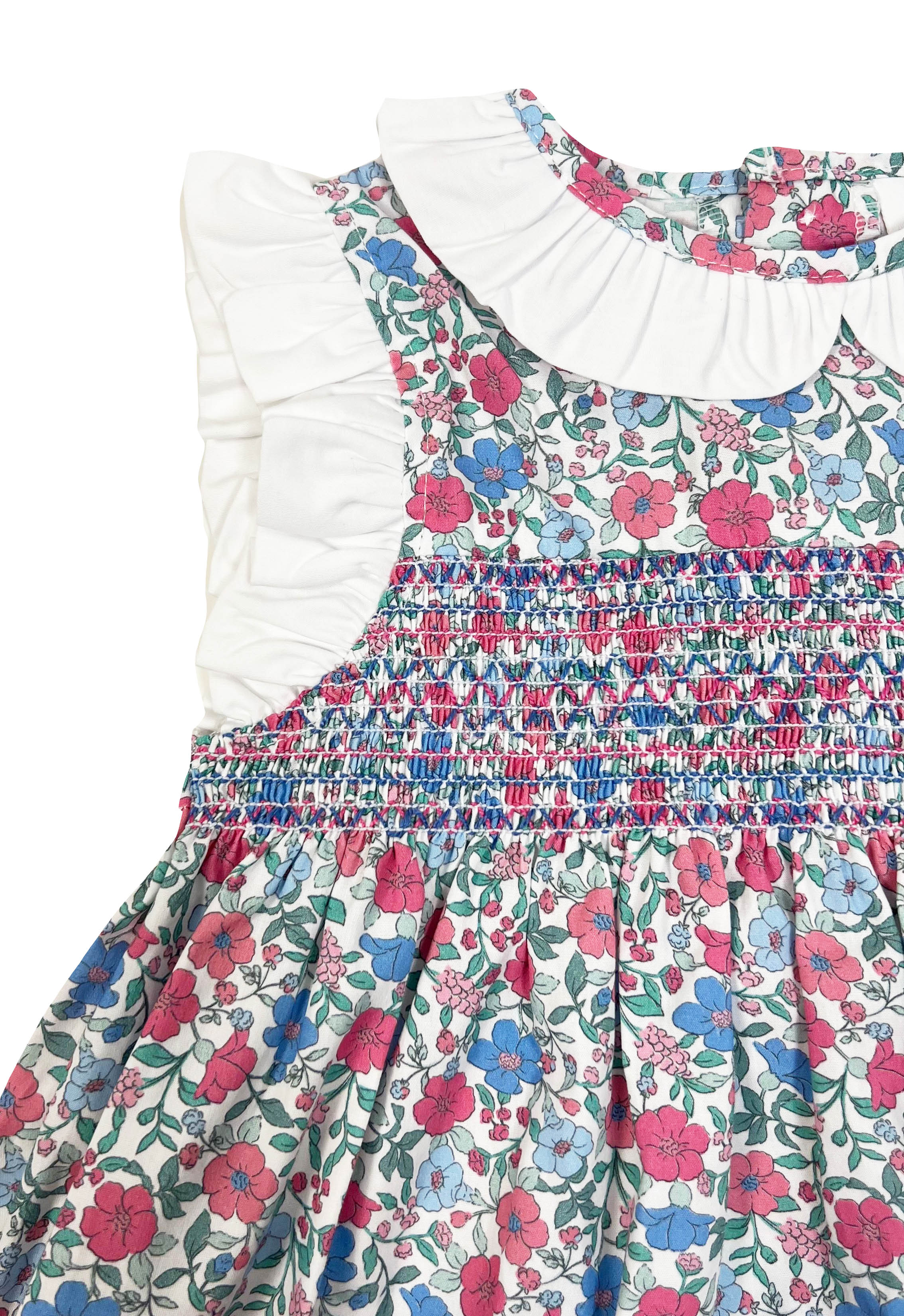 Vestido de verano en estampado floral con tonos rosas y azules. Hecho en España por m&h. Incluye pololo a juego hasta 2A.